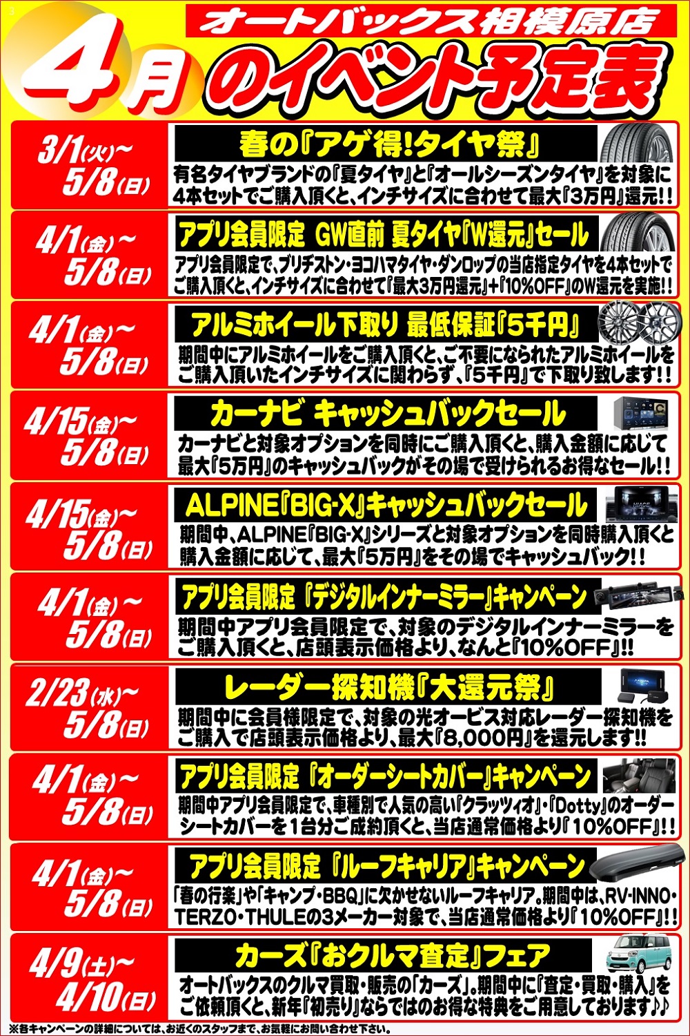 2022年4月 オートバックス相模原 イベント情報 みなさんこんにちは!! タイヤメーカー出荷価格値上により 5月9日より当店のタイヤが値上がりになります( ;∀;) 今月もお買得商品盛り沢山!! 皆様のご来店を 心よりお待ちしております。 今月のイベントはこちら