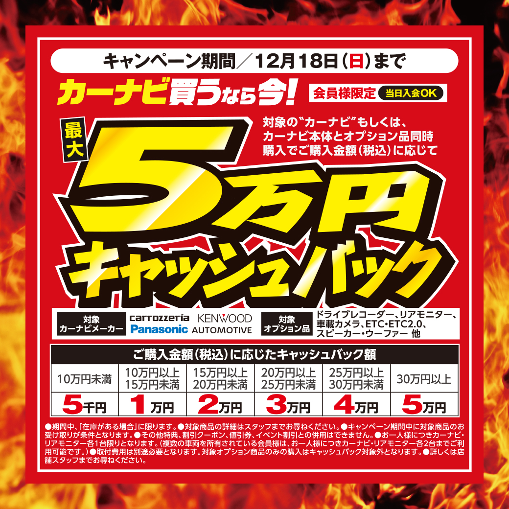 【対象のカーナビ購入で最大5万円のキャッシュバック】