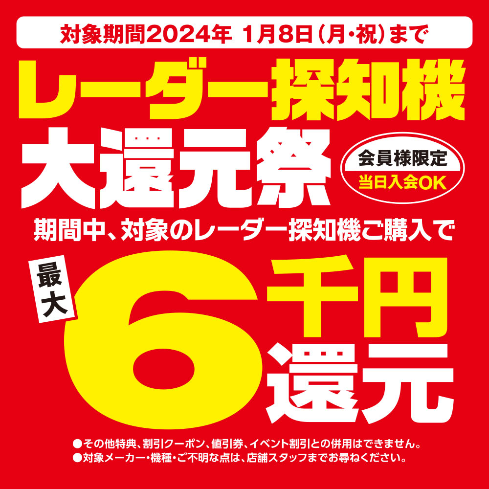対象のレーダー探知機ご購入で最大6千円を還元致します。