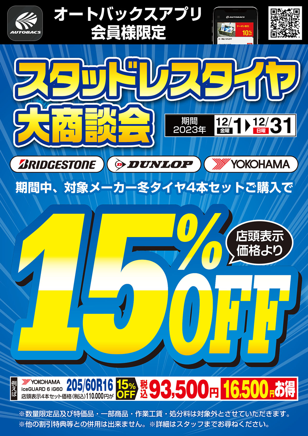 アプリ会員様限定、対象のスタッドレスタイヤ4本セットを15%OFFにてご提供致します!
