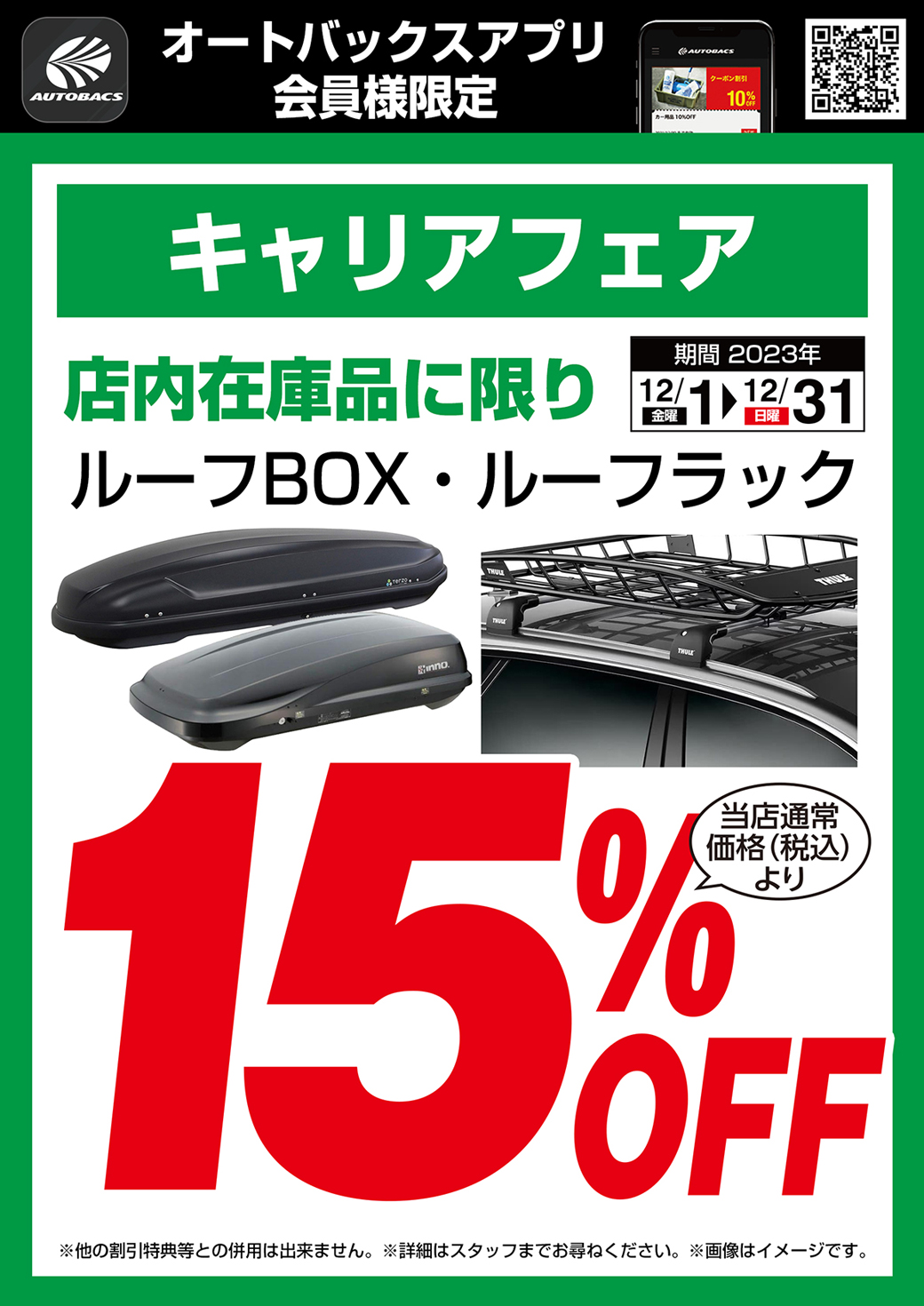 キャンプはもちろん、ウインタースポーツにお出かけの際にも大活躍するルーフボックスやルーフラックを店内在庫品に限り15%OFFにてご提供致します。