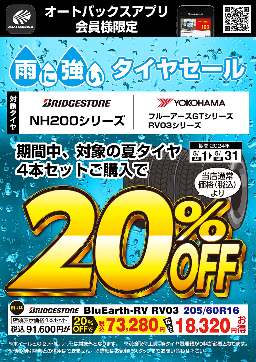 ウェット性能に優れたブリヂストン&ヨコハマタイヤの対象商品を4本セットで通常価格から20%OFFにてご提供致します(^^)/