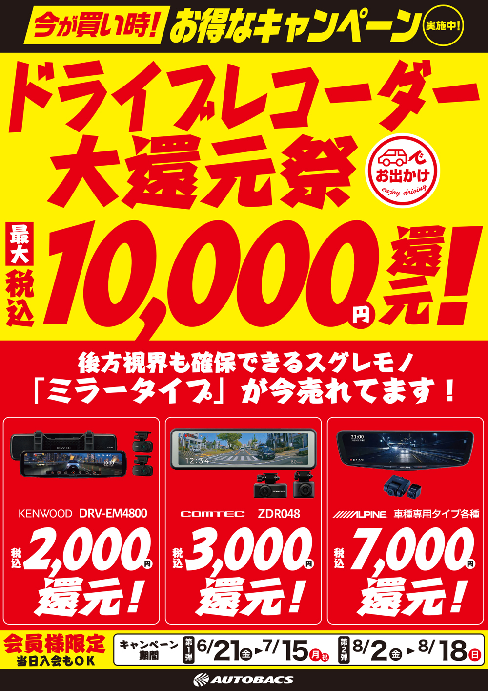 対象のドライブレコーダーご購入で最大1万円のキャッシュバックします。