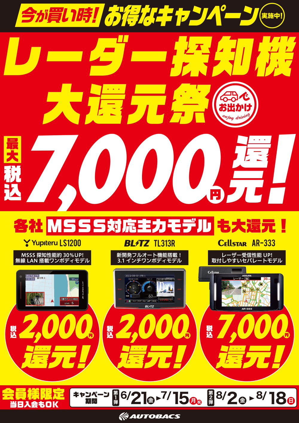 対象のレーダー探知機ご購入で最大7千円還元致します!