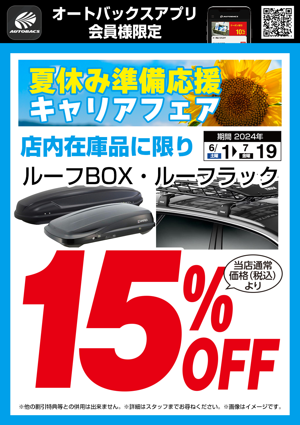 たくさんの荷物を積んでお出かけする際の必須アイテム「ルーフBOX・ルーフラック」を店内在庫品に限り15%OFFにてご提供致します!
