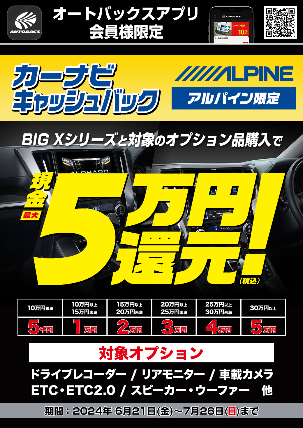 大画面ナビの大定番、アルパイン「BIG Xシリーズ」とオプション品のご購入金額に応じて、最大5万円還元致します!