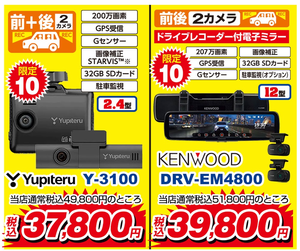 フロント1カメラ+リア2カメラの合計3カメラタイプで前方と後方に加えて車室内の録画も可能な「ユピテルY-3100」が10台限定37,800円!!