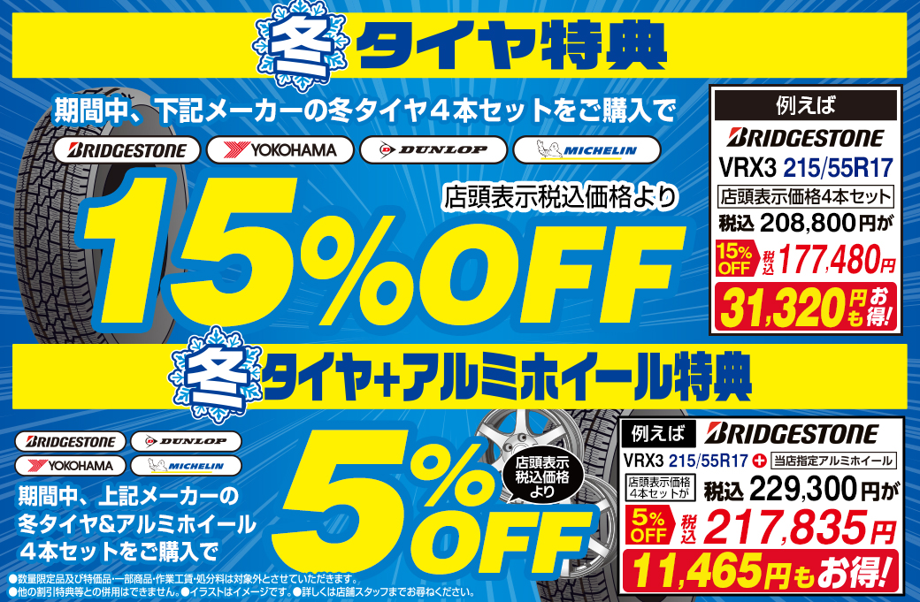 対象のスタッドレスタイヤ4本セットご購入で15%OFF致します。