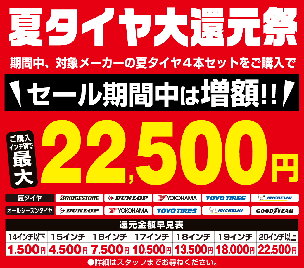 対象の夏タイヤ4本セットのご購入で最大22,500円還元致します。