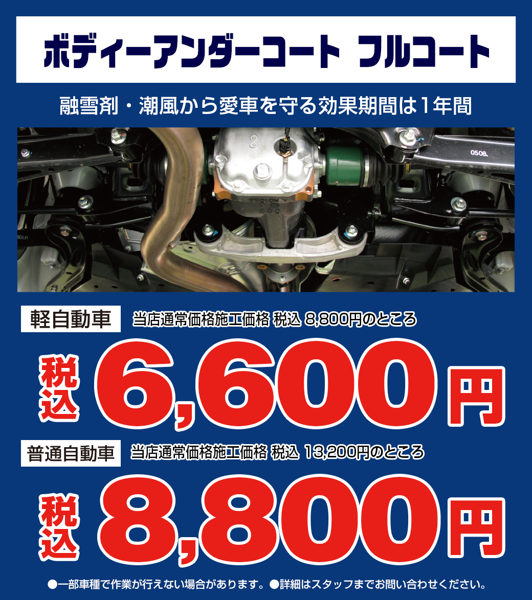 雪や雨、凍結防止剤から愛車を守るボディーアンダーコーティングもお得な価格で施工致します。