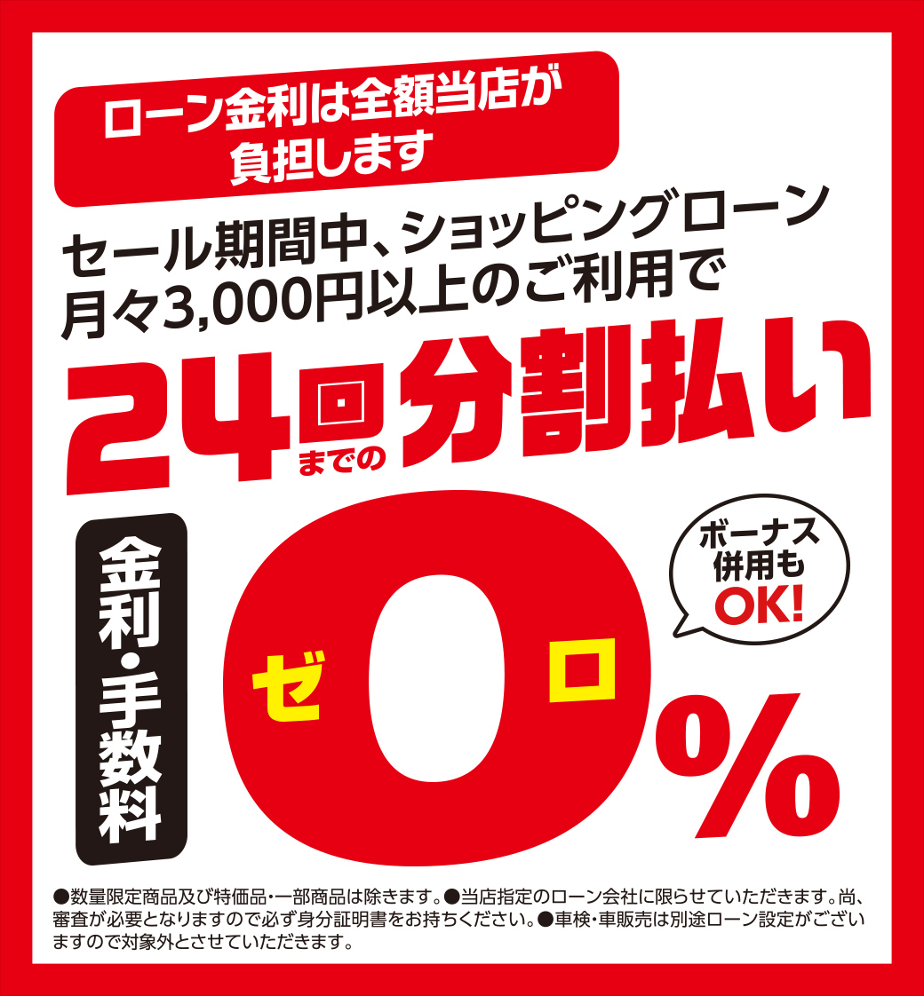当店指定のローン会社にて月々3,000円以上のショッピングローンご利用で、24回払いまで金利手数料が無料。