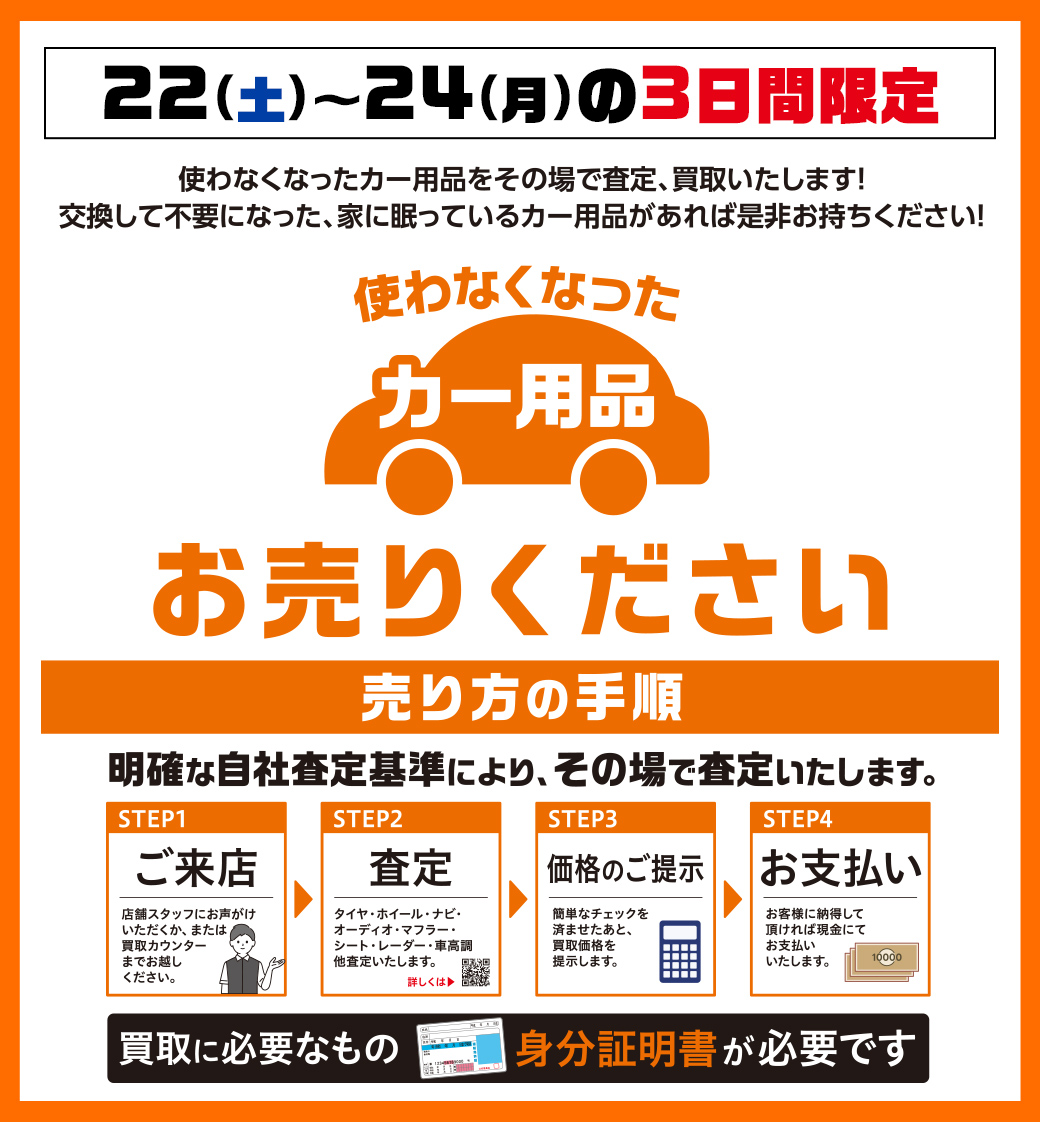 11月22日(土)~24日(祝)の3日間、ご不要なカー用品をその場で査定して買取致します。