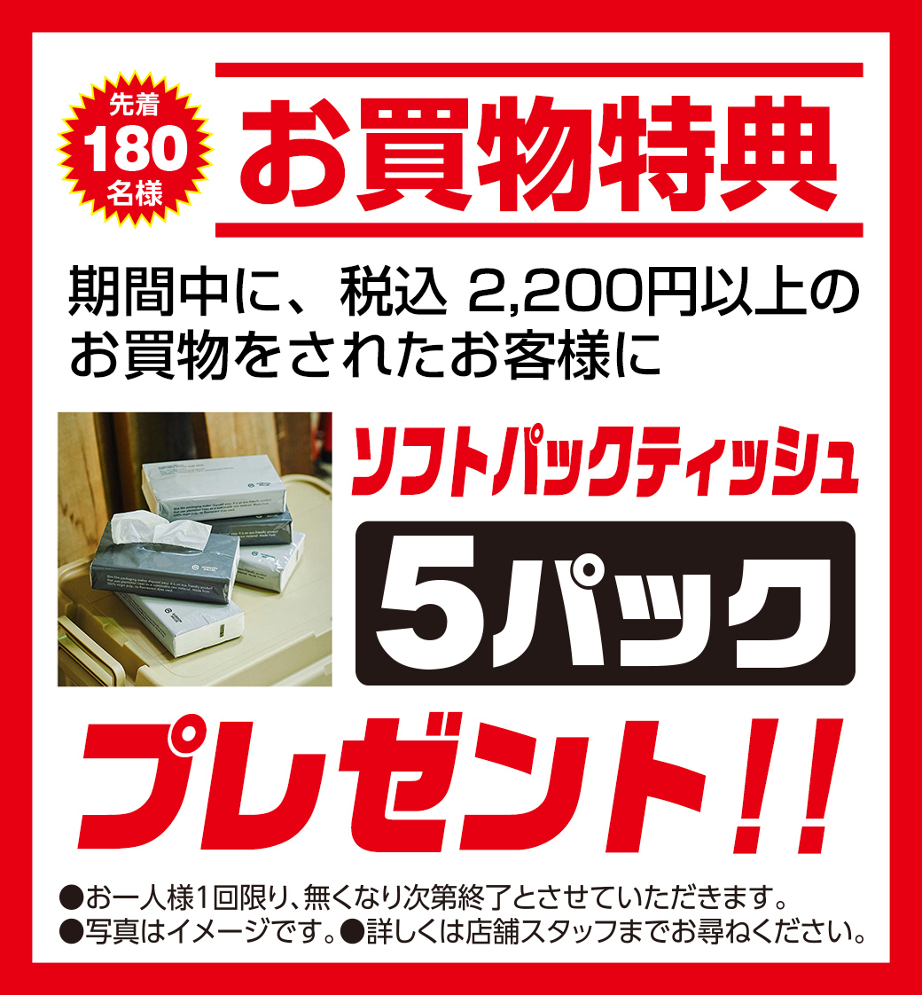 19周年セール期間中に2,200円以上のお買い物を頂いたお客様先着180名様にソフトパックティッシュ5箱をプレゼント致します。
