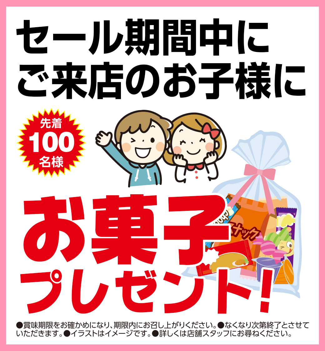 19周年セール期間中にご来店のお子様先着100名様にお菓子をプレゼント致します(^.^)/~~~