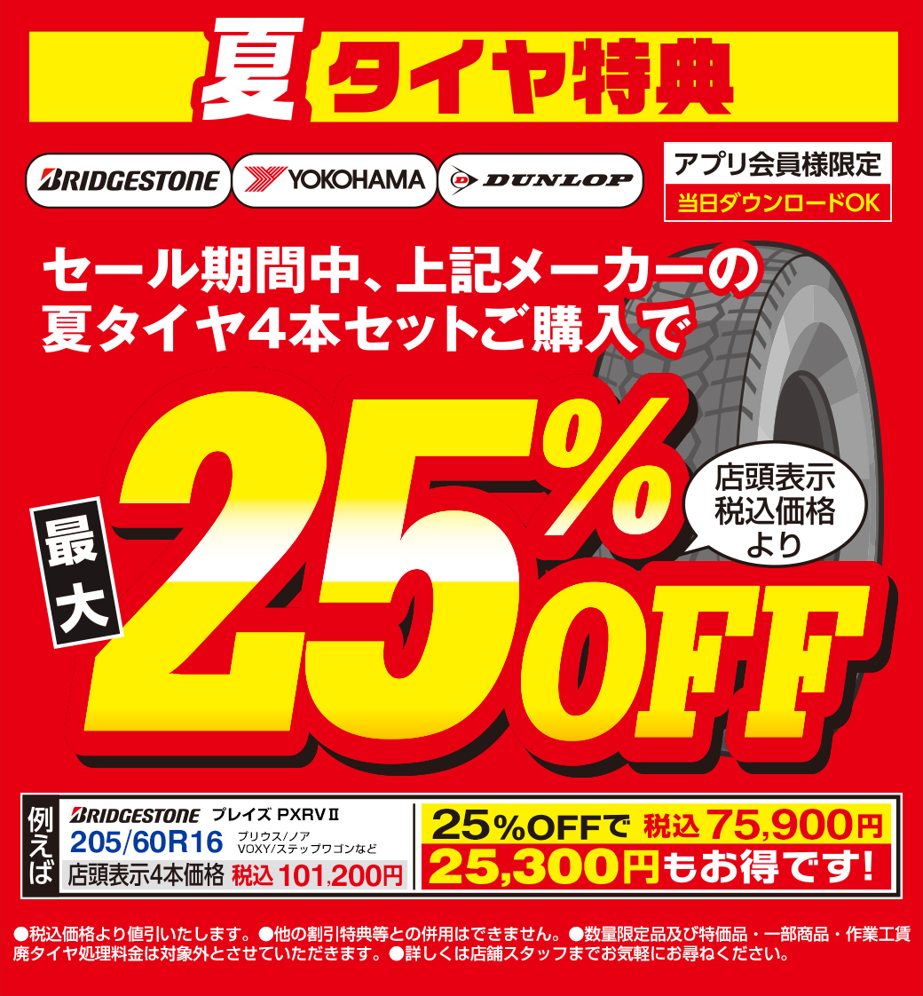 当店指定の夏タイヤを4本セットで25%OFF致します!!