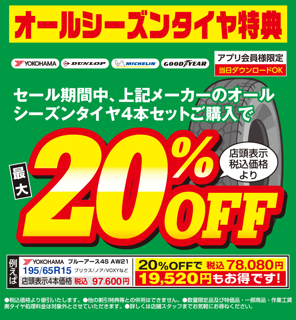 当店指定のオールシーズンタイヤ4本セットで20%OFF致します!