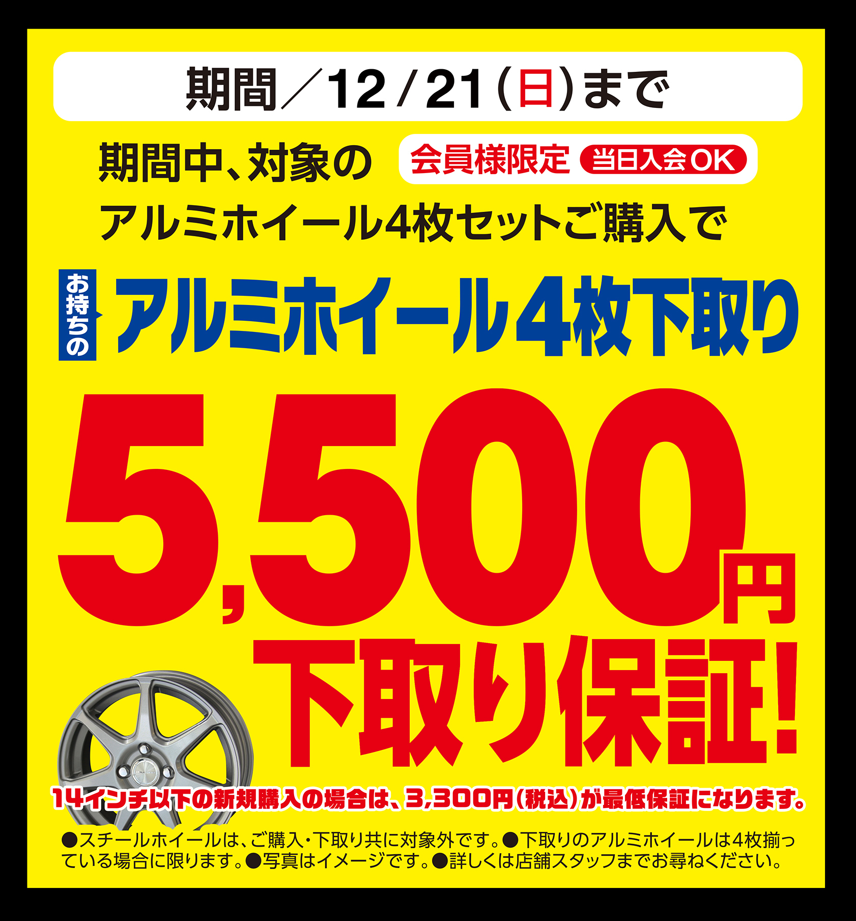 ※15インチ以上のアルミホイールは5,500円、14インチ以下のアルミホイールは3,300円にて下取り致します。