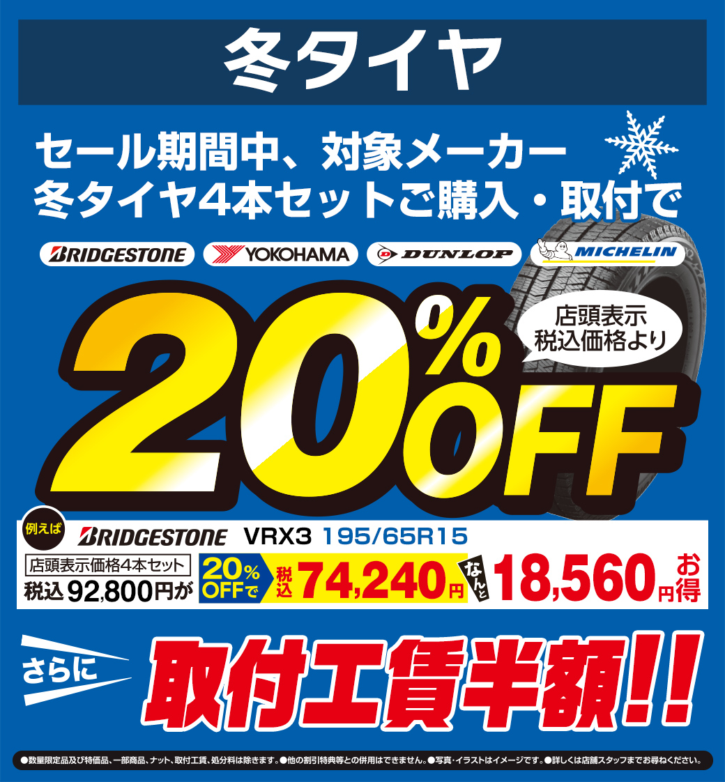 当店指定のスタッドレスタイヤ4本セットで20%OFF&工賃半額ととってもお得!