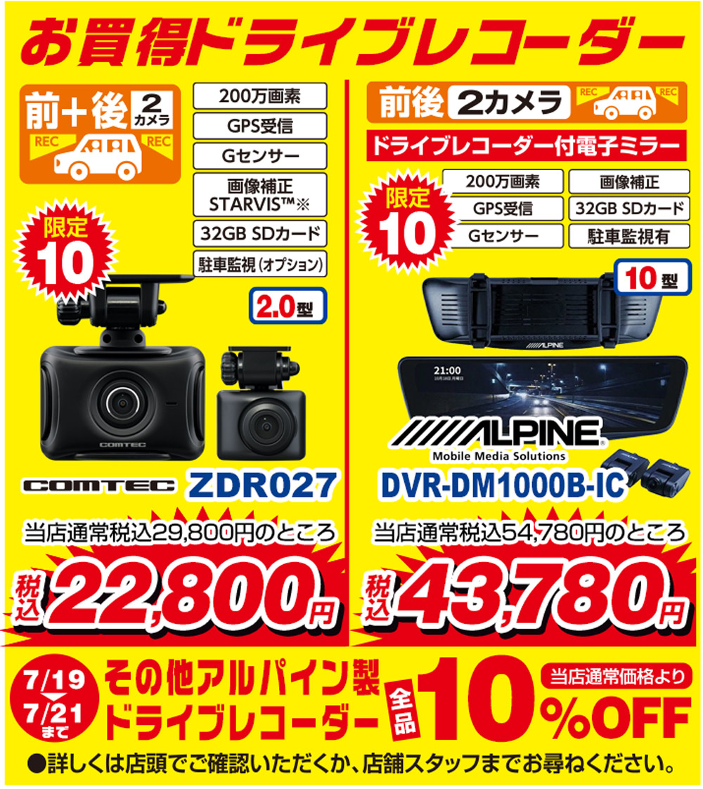 前後2カメラタイプのドライブレコーダーとアルパインのデジタルインナーミラーを各限定10台のお買い得価格で販売致します!
