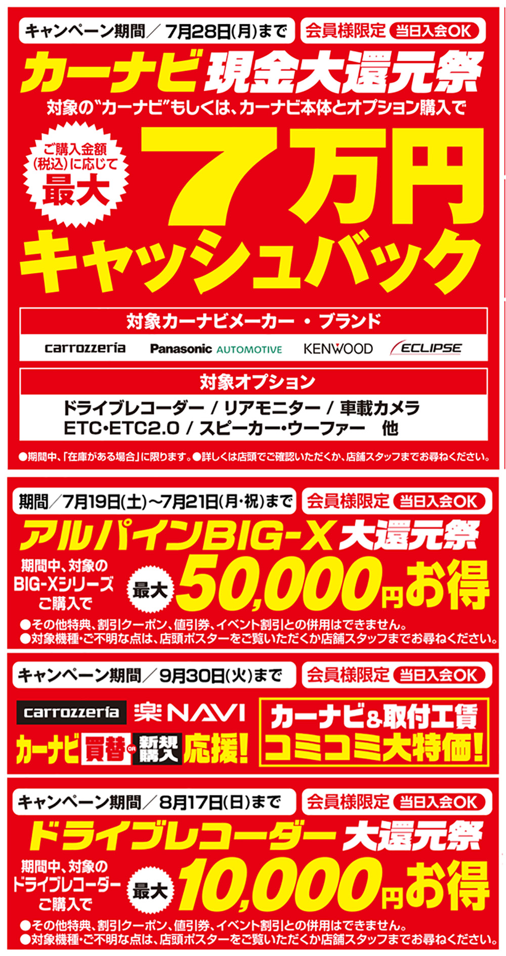 期間中に対象のカーナビとオプション品のご購入で、購入金額に応じて最大7万円をキャッシュバック致します(^^)/