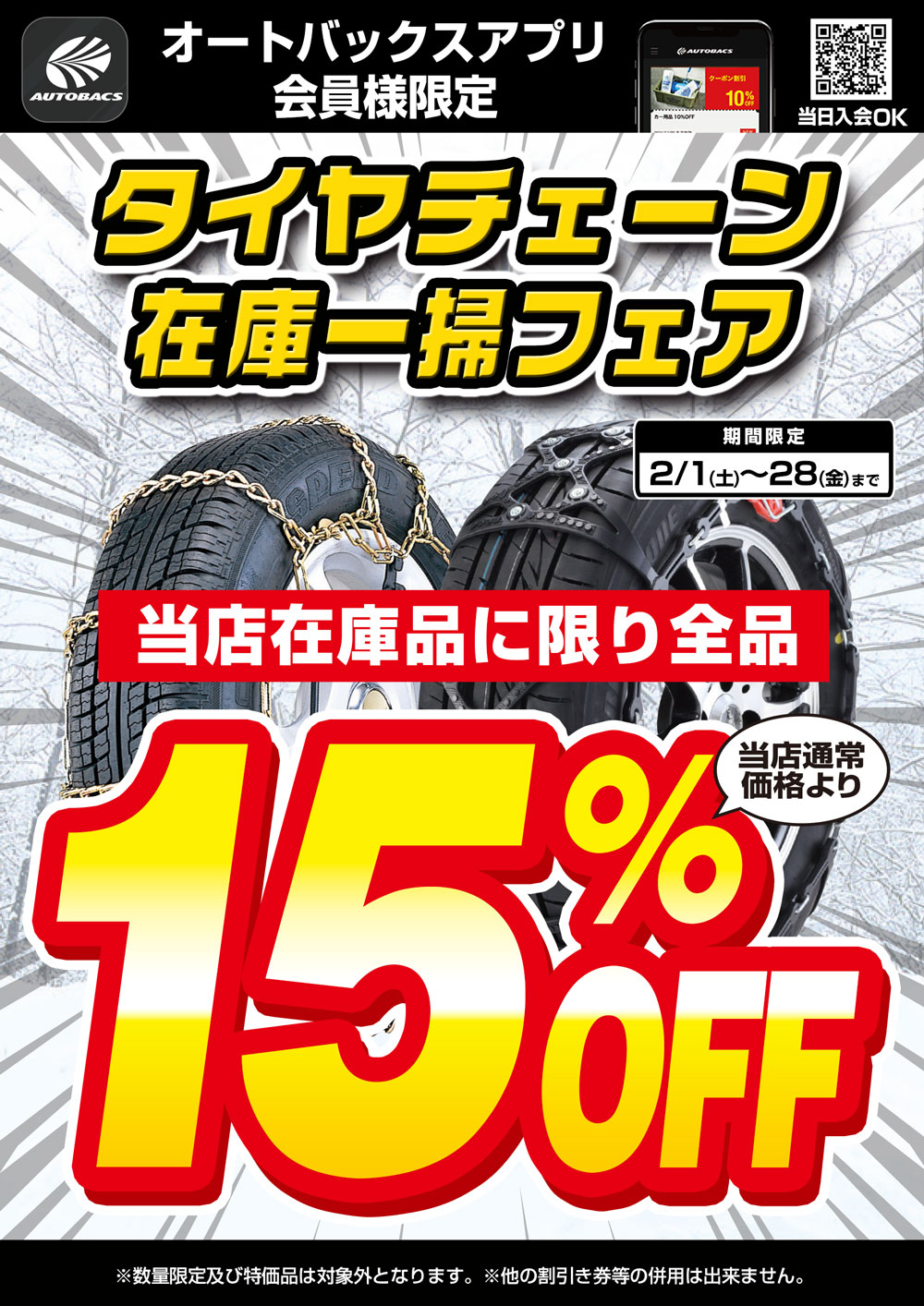 タイヤチェーンの店内在庫品に限り、15%OFFにて販売致します!