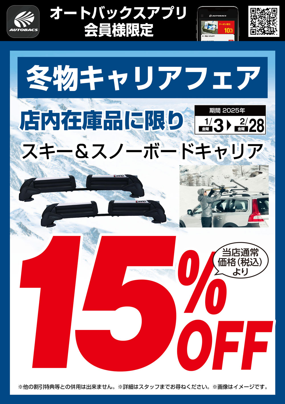 スキーやスノーボード用のキャリアを店内在庫品に限り15%OFFにて販売中です。