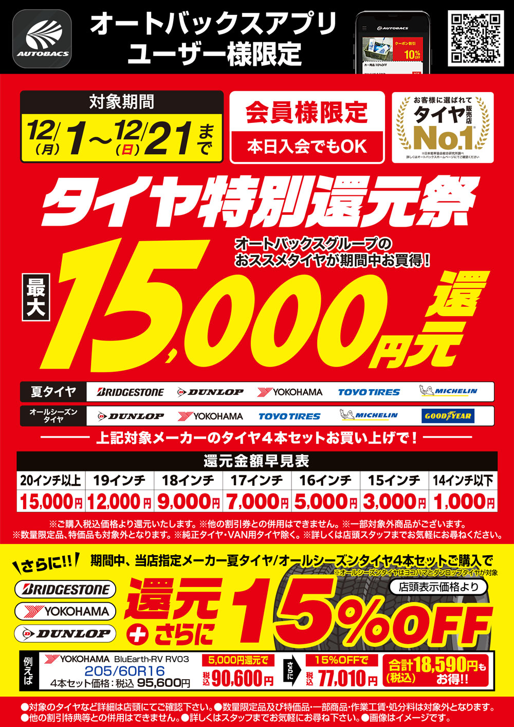 ブリヂストン・ヨコハマ・ダンロップの夏タイヤ4本セットや対象のオールシーズンタイヤ4本セットご購入で、最大15,000円の還元企画に加えて、更に15%OFFと大変お得になっております!!