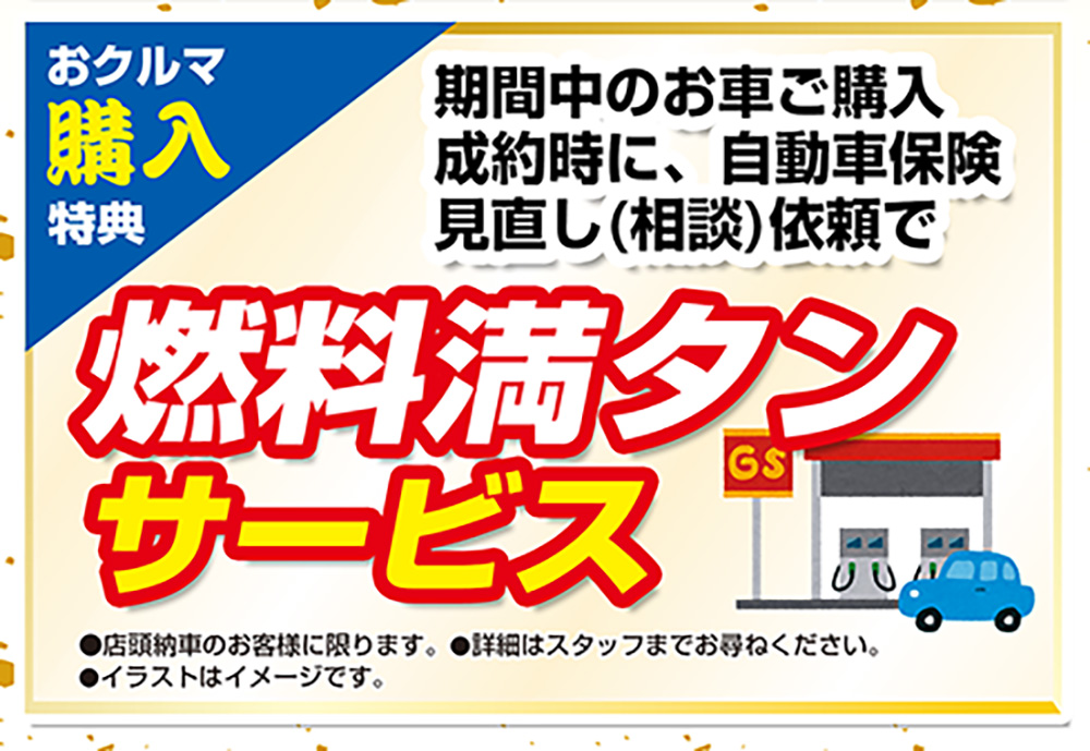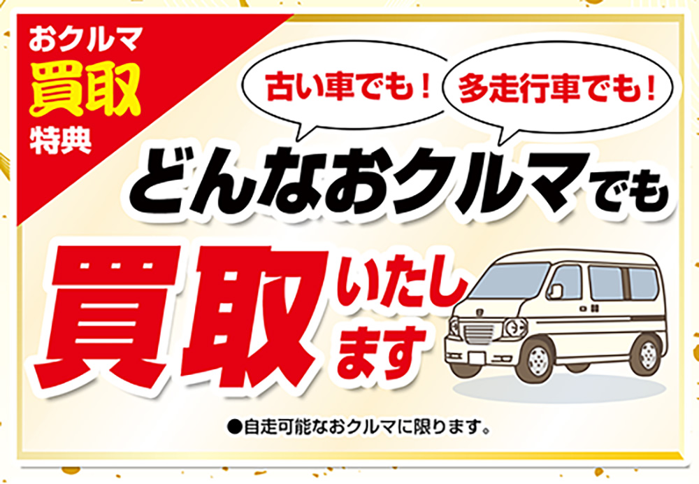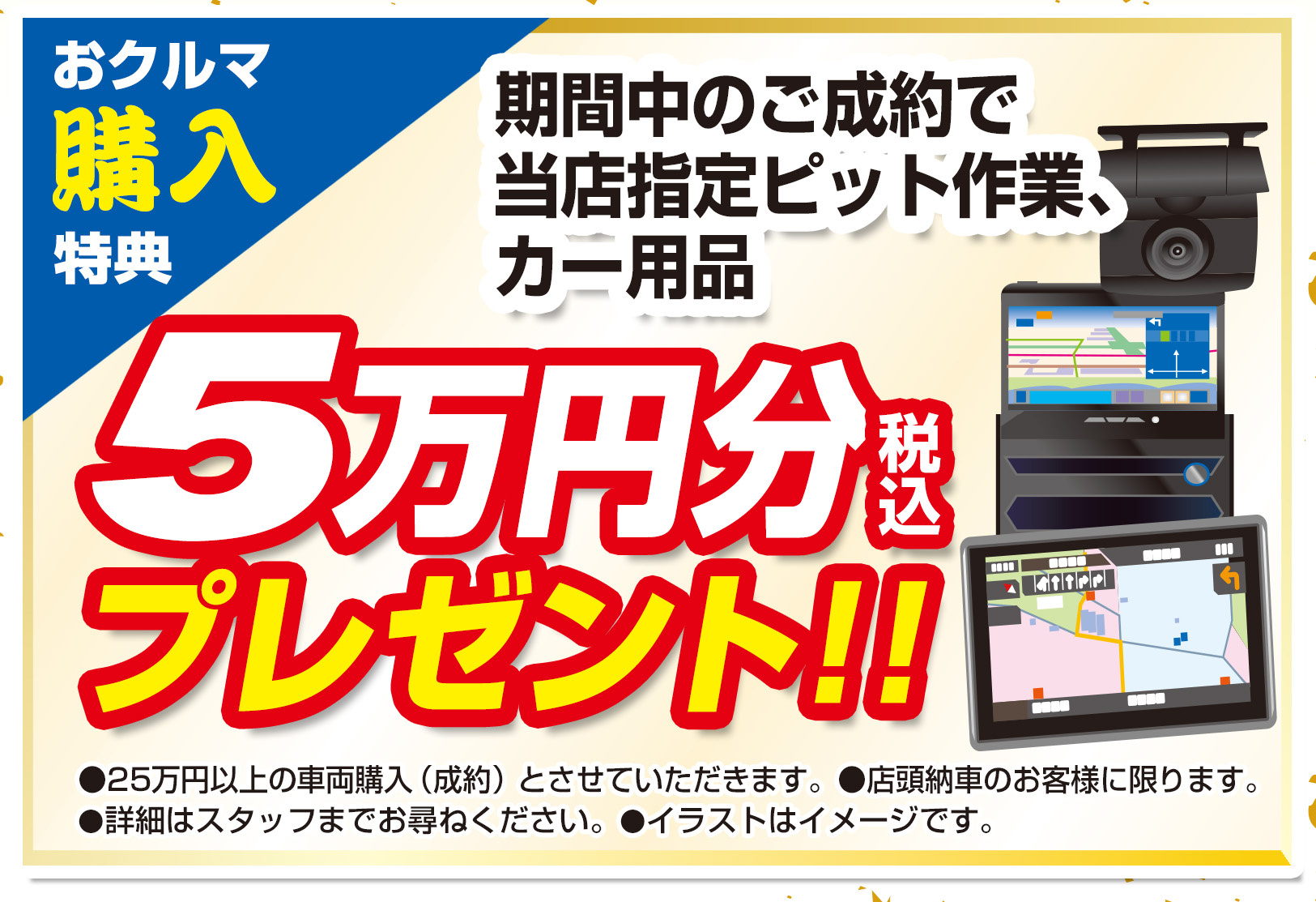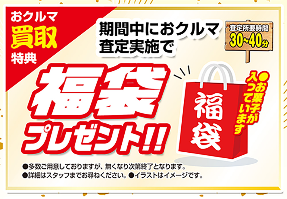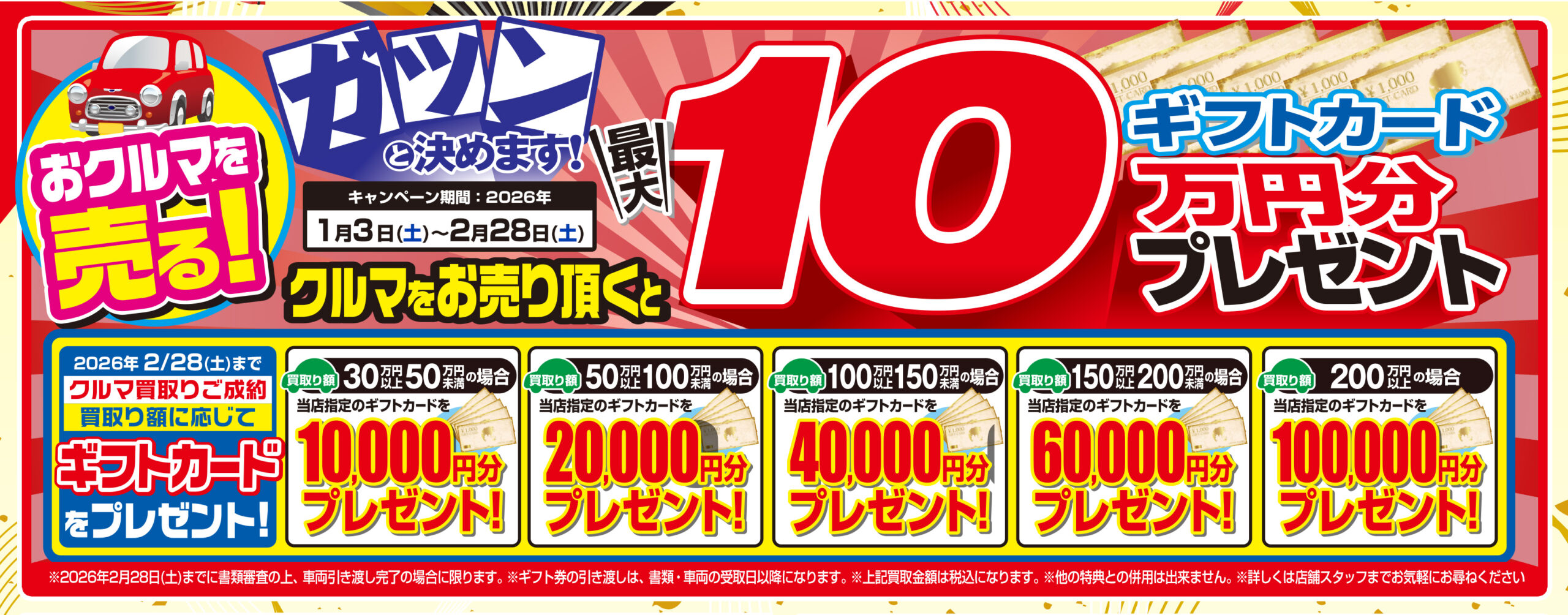 2026 おクルマ買取販売 新年大感謝セール 2026年1月3日(土)~1月31日(土)までの間おクルマ買取販売大感謝セールを開催いたします!期間中におクルマをご購入で特典が盛りだくさん! 期間中に、愛車をお売り頂くと10万円分のギフトカードプレゼント! おクルマ買取特典 1 おクルマ買取特典 2 おクルマ購入特典 1 おクルマ購入特典 2