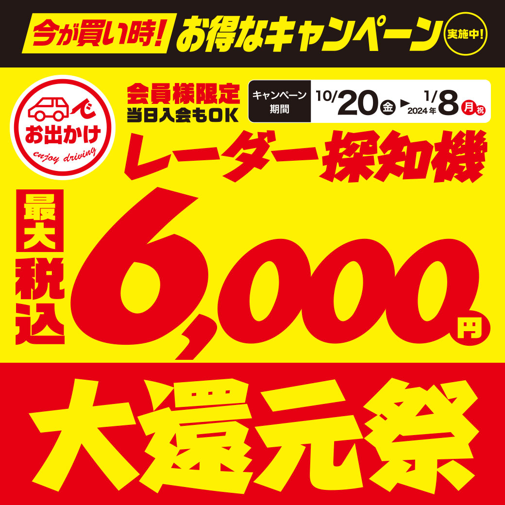 対象のレーダー探知機ご購入で最大6千円の大還元祭開催中です!