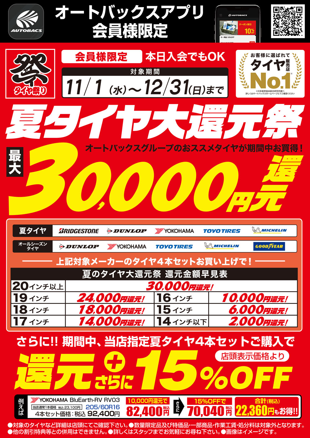当店指定の夏タイヤ4本セットご購入で、最大3万円の現金還元と更に15%OFFにてご提供致します。