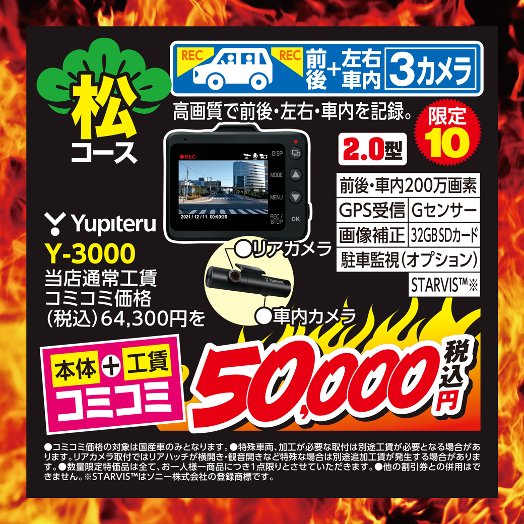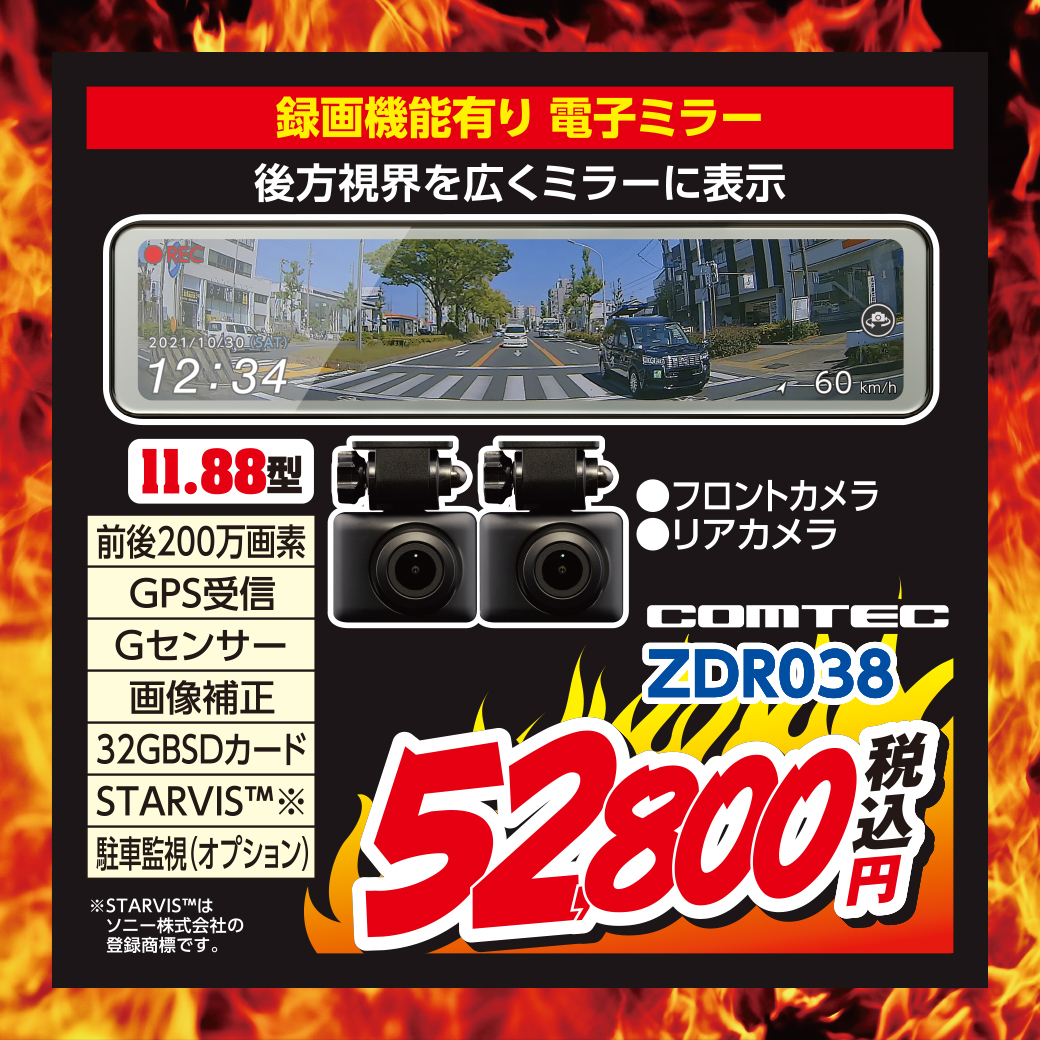 ドライブレコーダーがお得! 38周年セール数量限定のドライブレコーダー等ドライブレコーダーと電子ミラーのお得情報をご紹介!【前後3カメラで前後・左右・車内を録画可能】 【当店売れ筋NO.1の前後ドライブレコーダーがお得】【前後2カメラドライブレコーダーがコミコミ3万円】【その他のモデルもWチャンスキャンペーンでお買得】【後方の安全確認に電子ミラーがお薦め】【ドライブレコーダー機能も搭載した電子ミラー】
