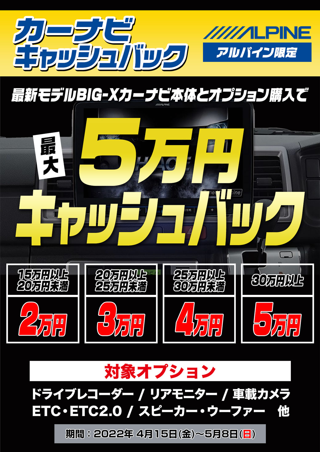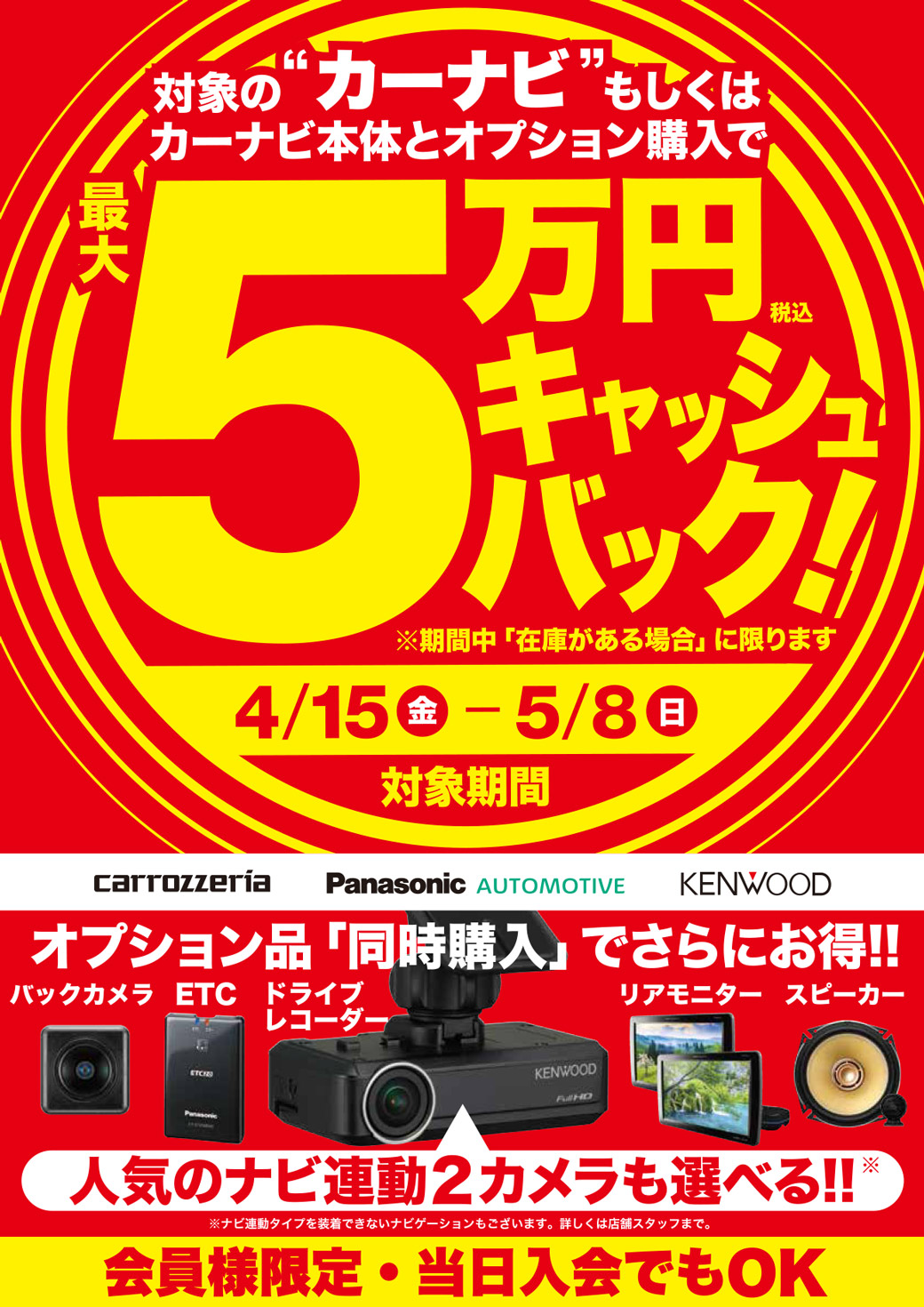 人気のカーナビゲーションが最大5万円のキャッシュバック!