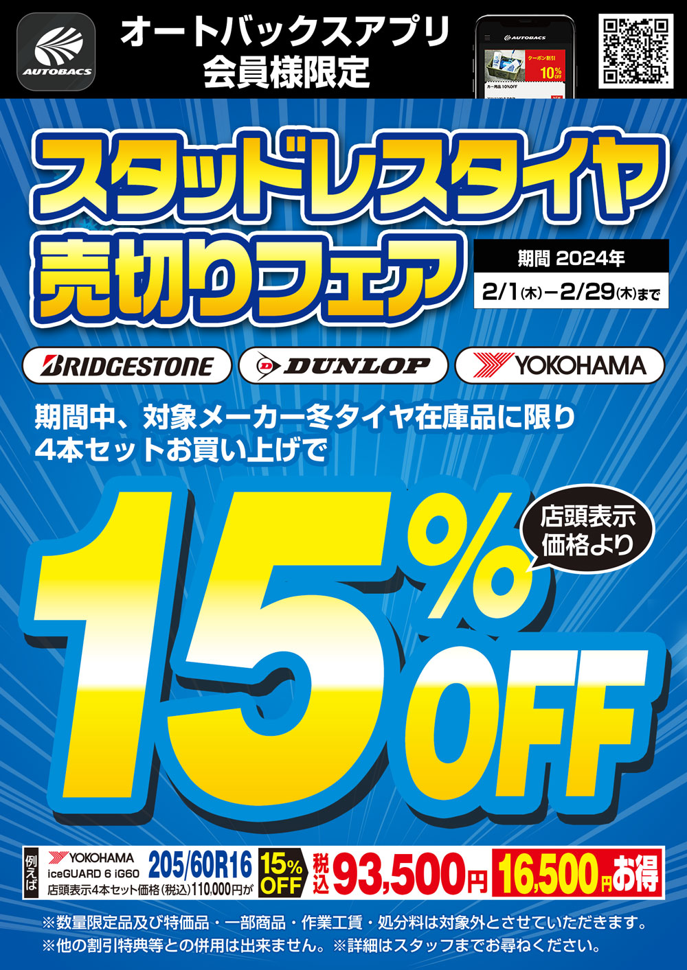 スタッドレスタイヤ4本セットを15%OFFにてご提供致します。