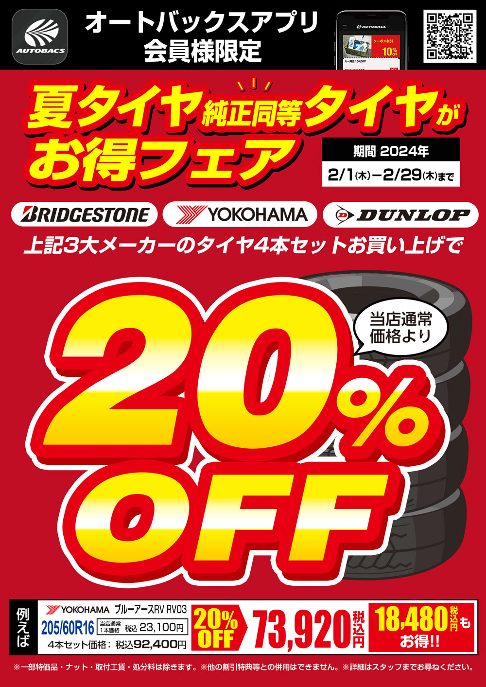 純正装着タイヤと同クラスのタイヤを4本セットで20%OFFにてご提供致します。