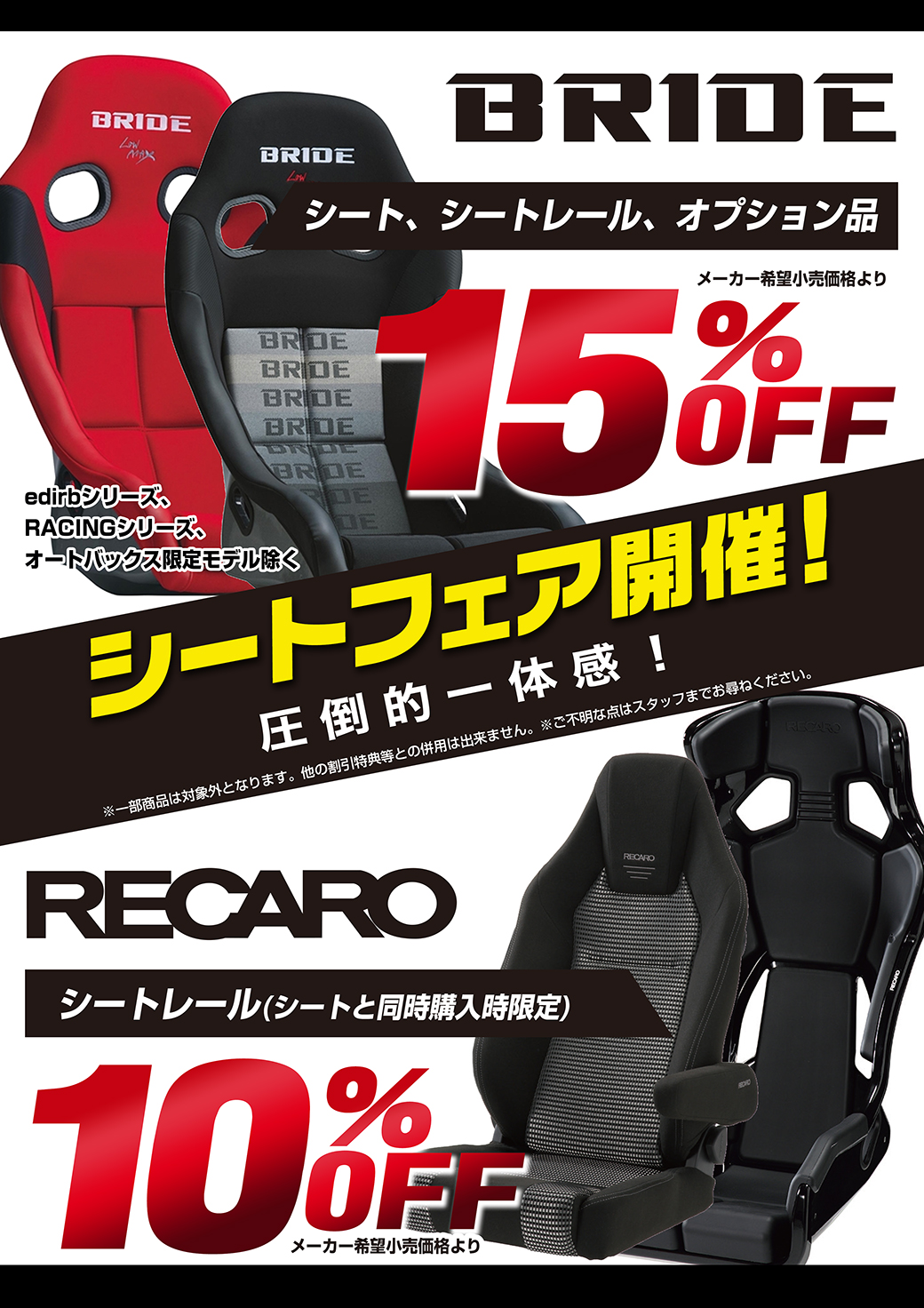 オートバックス海老名 スポーツシートフェア ドライブが変わる!スポーツシートフェア開催!日程:2023年11月1日(水)~26日(日)期間中のご成約で、BRIDEの対象商品が15%OFF、RECAROの対象商品が10%OFFと大変お得に購入する事が可能です!スポーツ走行やロングドライブの多い方は、この機会をお見逃しなく!