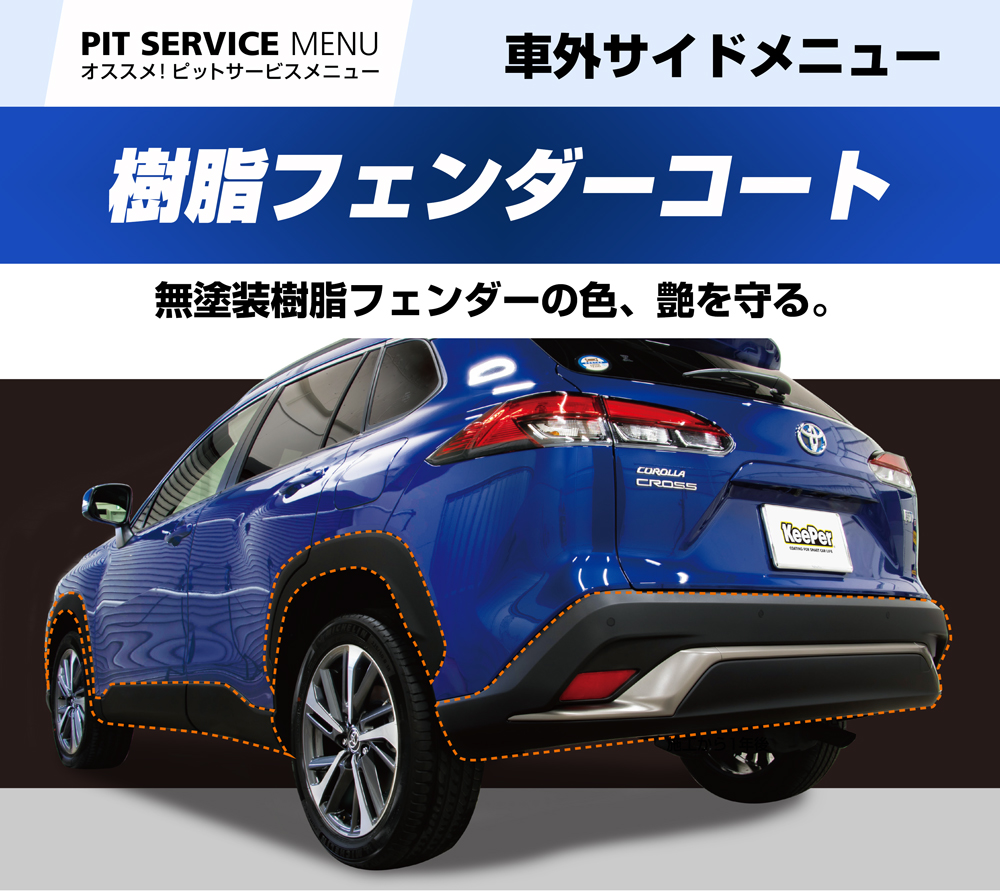 この無塗装樹脂が短期間に退色して白っぽくなる現象を防ぐピットメニューが「樹脂フェンダーコート」です。