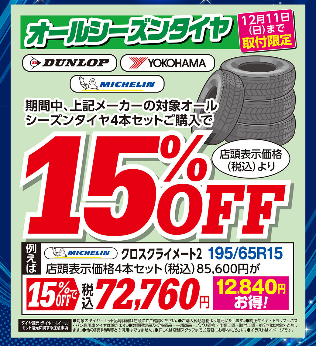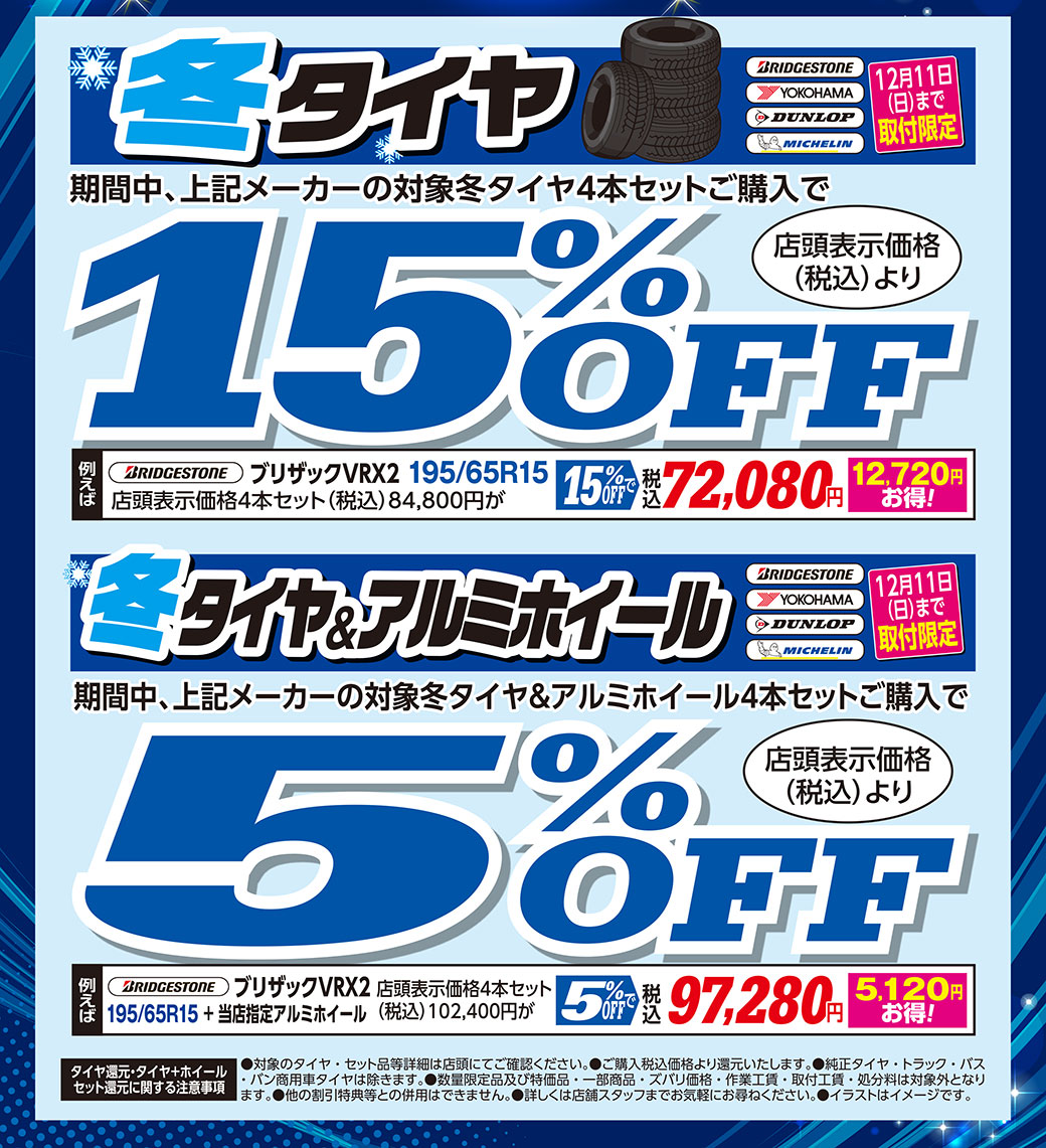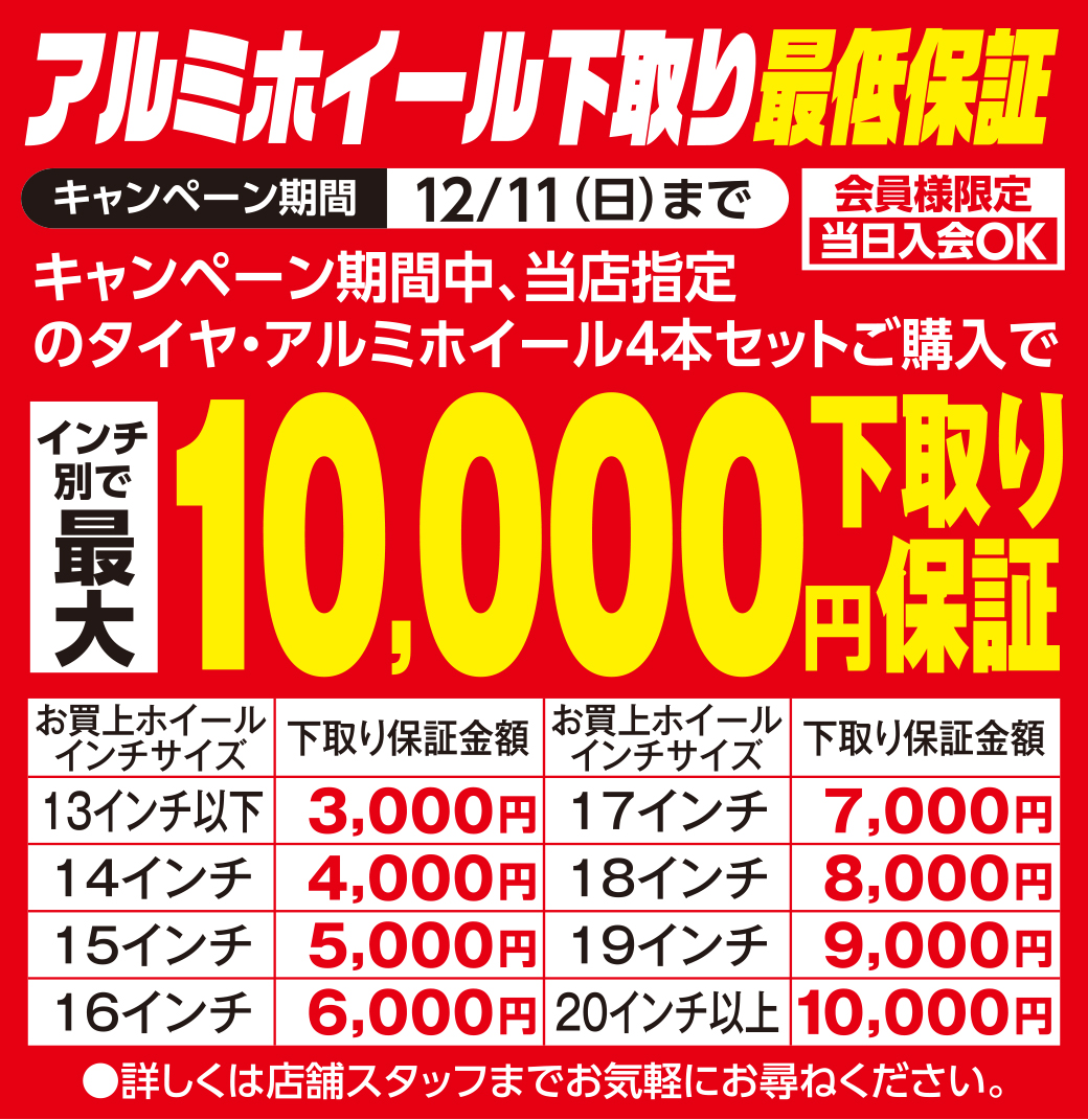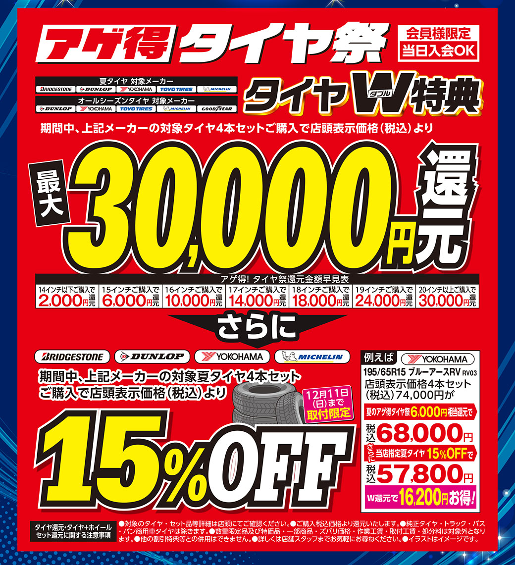 【東神奈川店】タイヤW特典でお買得! 最大3万円還元+更に割引き‼W特典でお買い得!スタッドレスタイヤもお買い得‼オールシーズンタイヤもお得に提供中‼突然起こるタイヤのトラブルにあんしんタイヤ補償今なら最低保証でお得!アルミホイール下取り致します。4枚揃えばキズがあってもOKです!タイヤ交換と同時作業がおススメ保管に困るタイヤ&ホイールお預かりします。お持ち帰りの手間もありません。