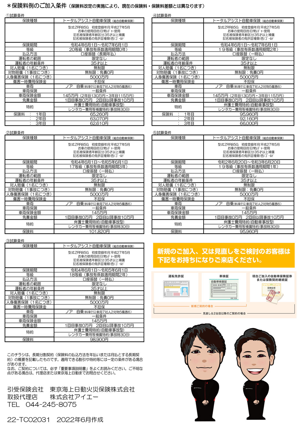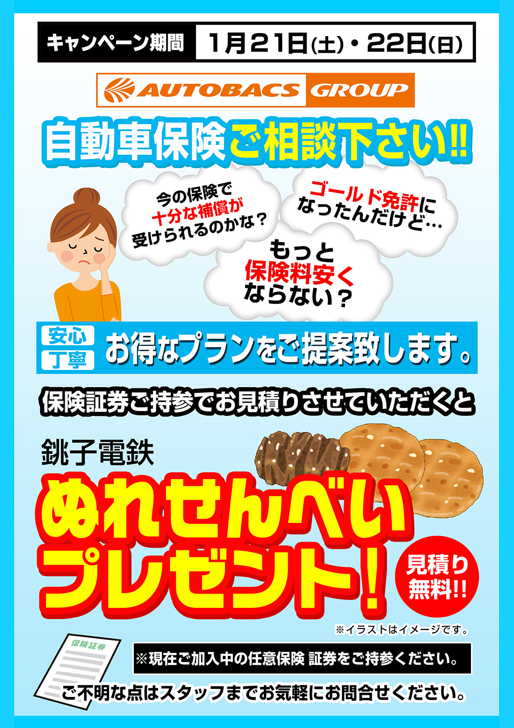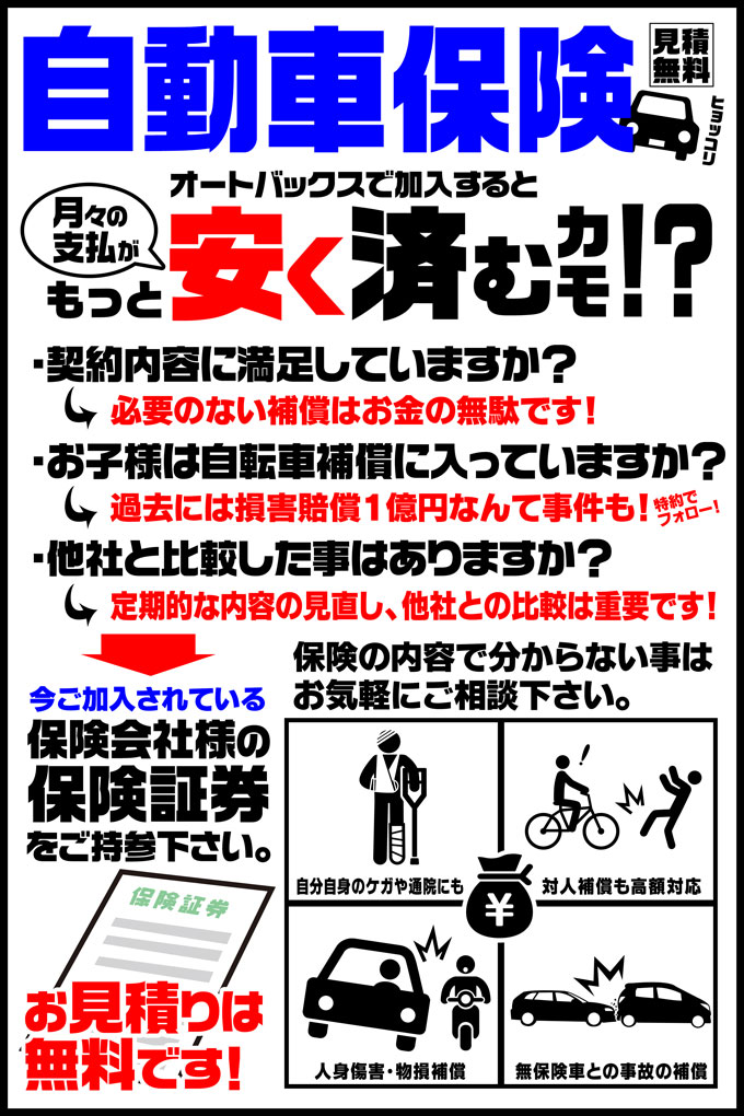 保険相談会開催! 1月21日・22日の二日間開催!ご加入の自動車保険の内容大丈夫ですか? どんな自動車保険に加入したらいいのか分からない…とか万が一の時の保証が分からない…そんな方が意外と多いんです。 どんな些細なことでもご相談ください!当店の自動車保険資格所有者がお答えいたします!自動車保険チェックポイント! 自動車保険お見積り無料!!