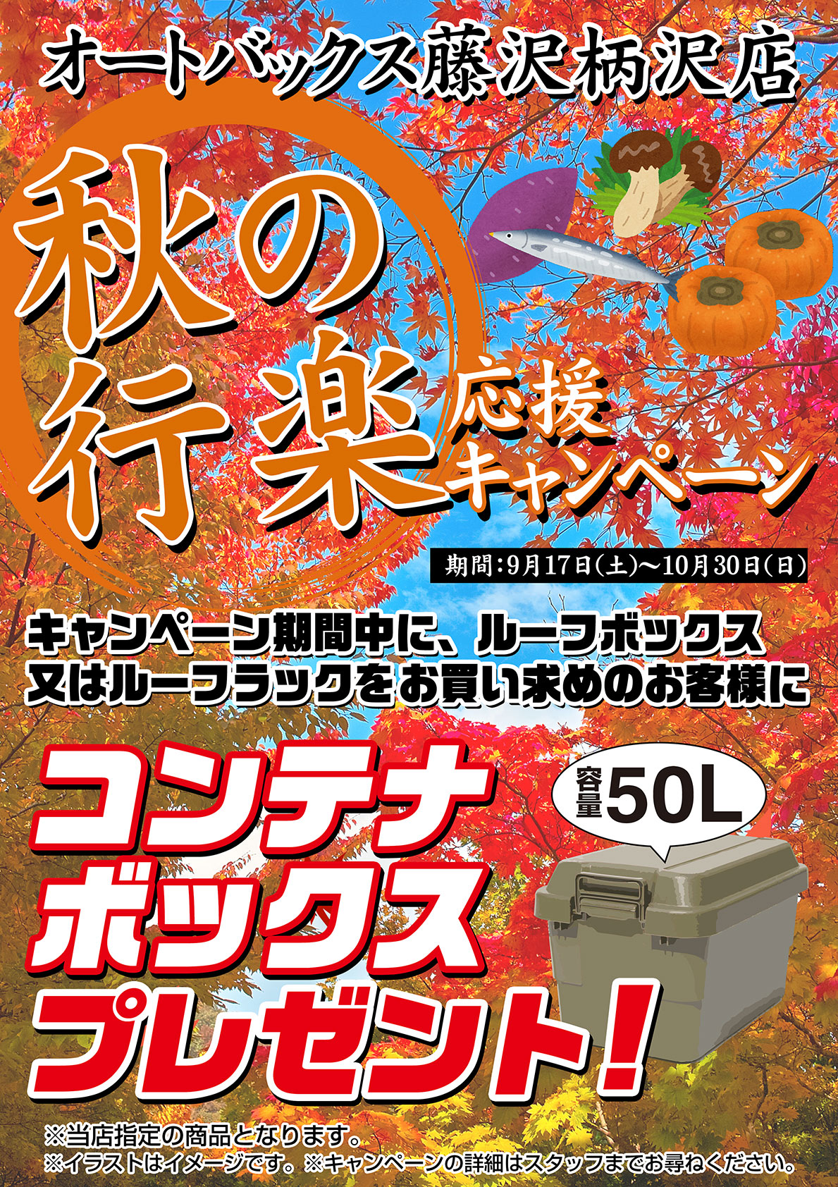 秋の行楽キャンペーン開催! 9/17(土)~10/30(日)まで秋の行楽キャンペーンを開催します!キャンペーン期間中に、ルーフボックス又はルーフラックを お買い求めのお客様にコンテナボックスをプレゼント!!