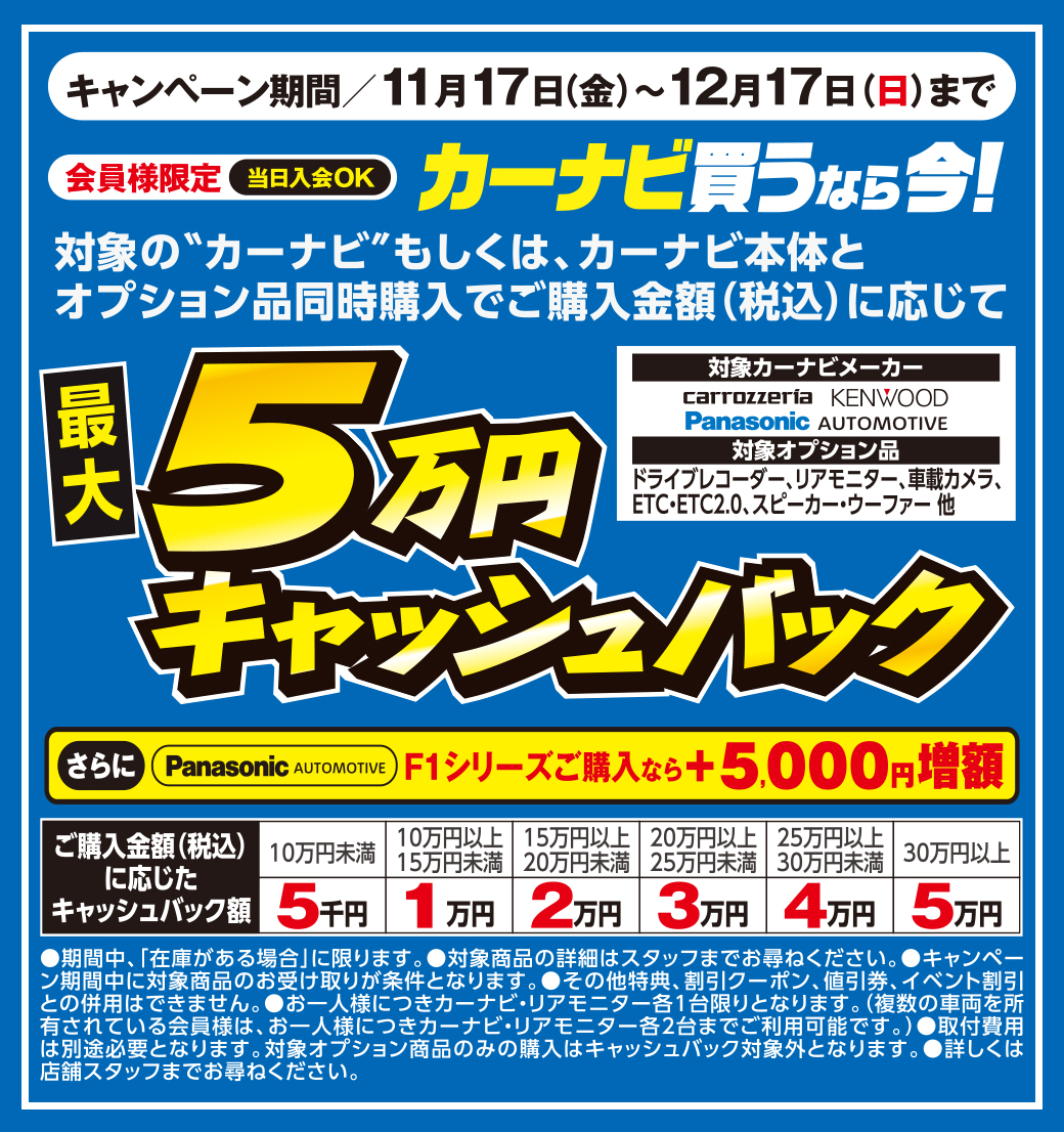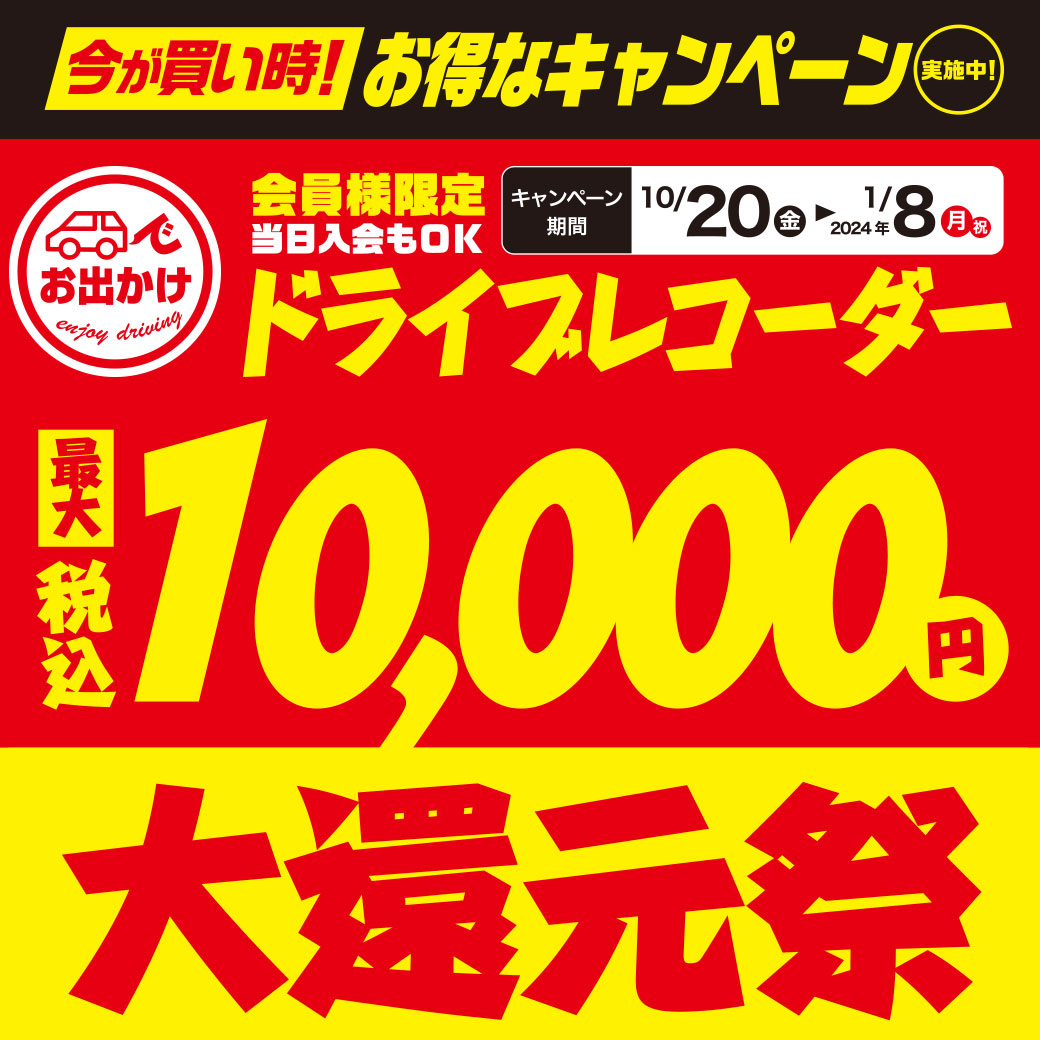 2023冬まつり レーダー&ドライブレコーダーがお得! 期間中、カーナビ本体と対象のオプション品ご購入で最大5万円キャッシュバック! セルスター ドライブレコーダーがお得! CS-91FHCD-30 RD-40 セルスター レーダー探知機がお得! AR-48LAAR-333期間中のご購入でレーダー探知機 最大6,000円還元!期間中のご購入でドライブレコーダー 最大10,000円還元!