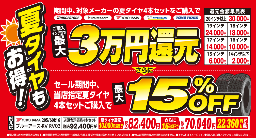 夏タイヤご購入で最大30,000円還元+15%OFF!
