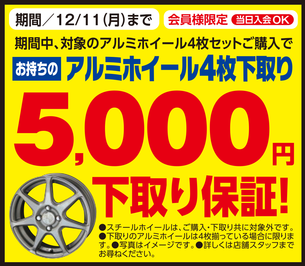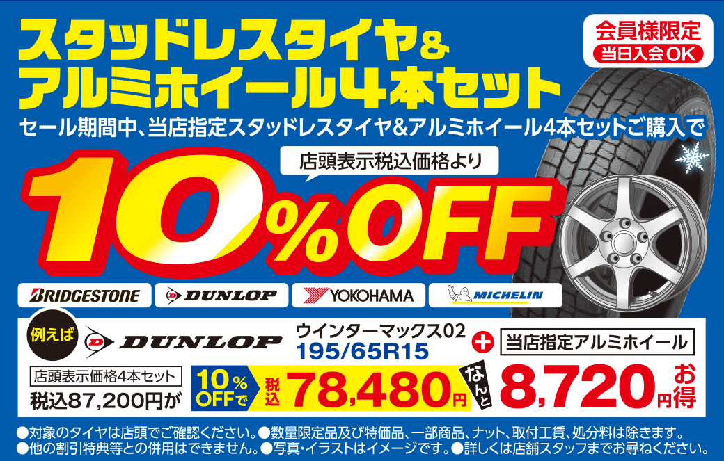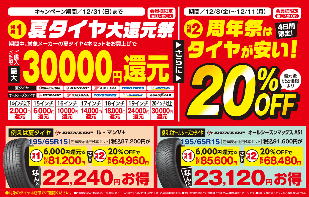 26周年祭 タイヤ&ホイールがお得! 事前予約も承っておりますので、是非店頭にてご相談ください!! 期間中対象の夏タイヤ4本セットのご購入で「最大3万円還元」と更に「20%OFF」にてご提供致します! 【スタッドレスタイヤが20%OFF】スタッドレスタイヤ+当店指定アルミホイールが10%OFF期間中、対象のアルミホイール4枚セットご購入で今、お持ちのアルミホイール4枚下取りいたします!