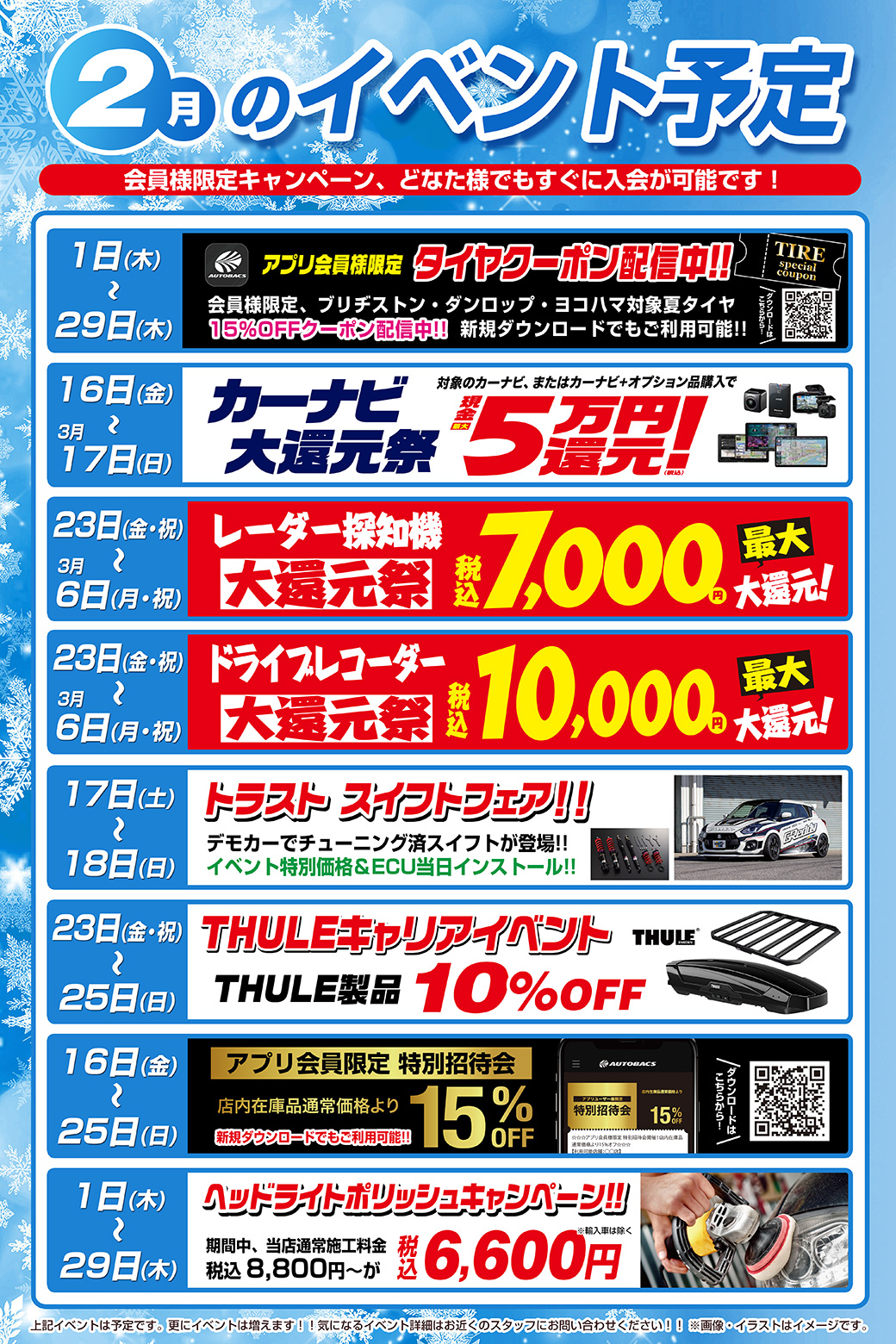 2月のイベント情報! 皆様こんにちは!!早くも1月が終わり2月に突入しました!! 2月はカーナビ最大50,000円キャッシュバックにTHULEキャリアイベントを開催!!また2月限定タイヤクーポンを配信致しますのでお見逃しなく!!(期間:2月1日(木)~29日(木) まだオートバックスアプリをダウンロードしていないお客様は下記のQRコードから是非インストールしてみてください!!