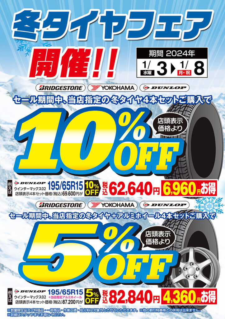 冬タイヤ・アルミセットフェア 皆様こんにちは!! 冬タイヤの準備はもうお済ですか?⛄冬タイヤが劣化などで交換をご検討されているお客様やまだお持ちではないお客様 1月8日(月・祝)まで冬タイヤ・アルミセットがお買い得となっております!! お見積もりだけでも大歓迎!! 是非当店までお問い合わせ下さい。