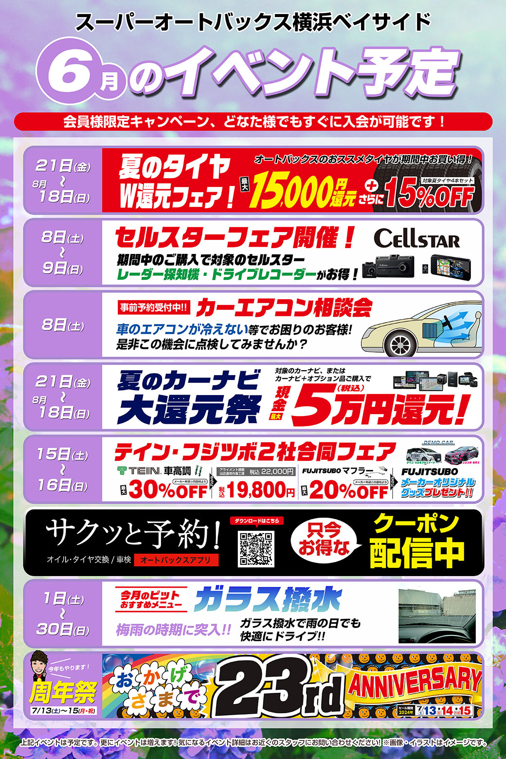6月のイベント情報≪横浜ベイサイド≫ 皆様こんにちは!!6月は梅雨の時期で、雨が多い日が続きますね…☔雨でフロントガラス、サイドガラスの視界が悪く運転しづらい方は是非当店おススメのガラス撥水を施工してみてはいかがでしょうか!?気になる方はお問い合わせください! また各イベントも予定しておりますのでお見逃しなく!!
