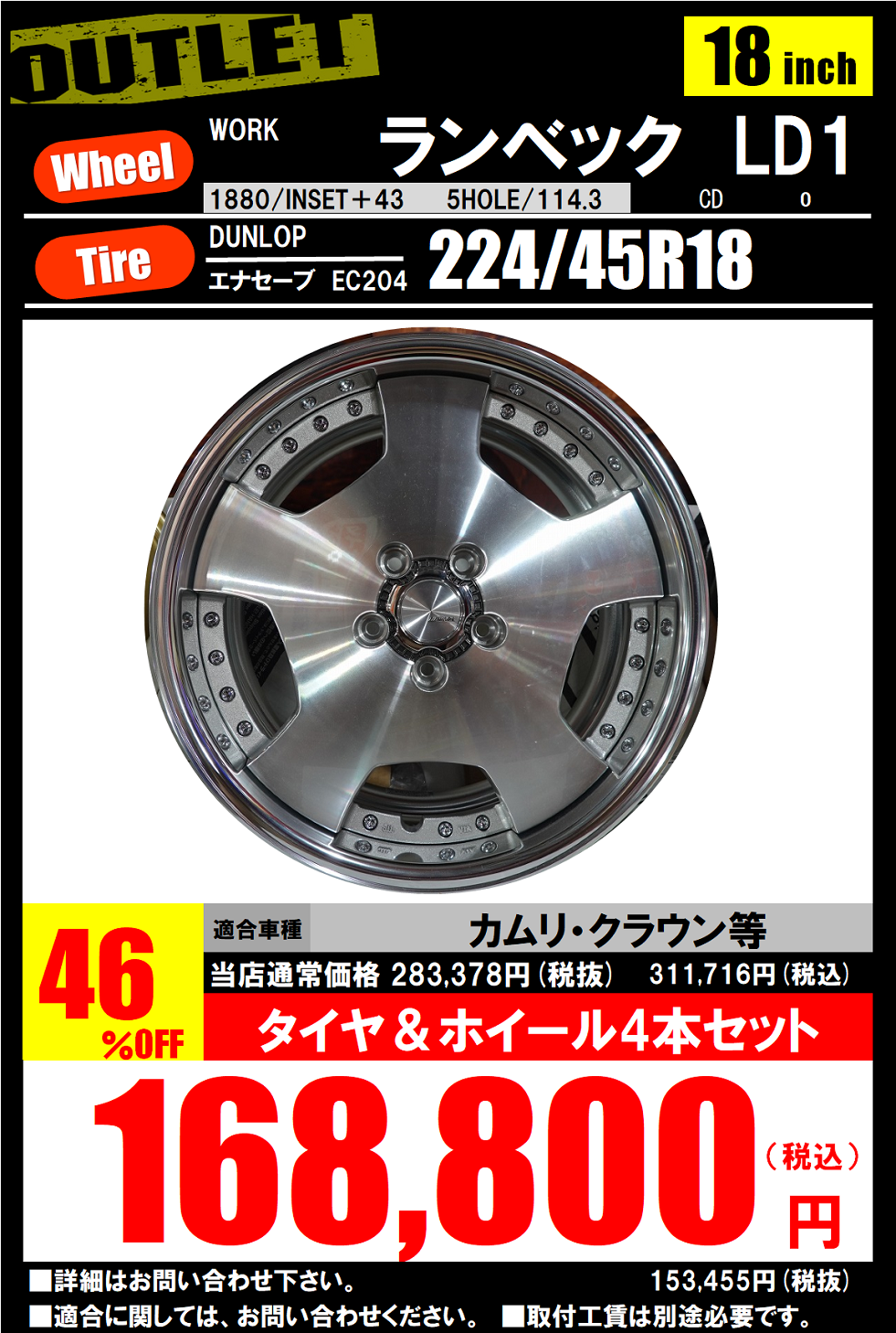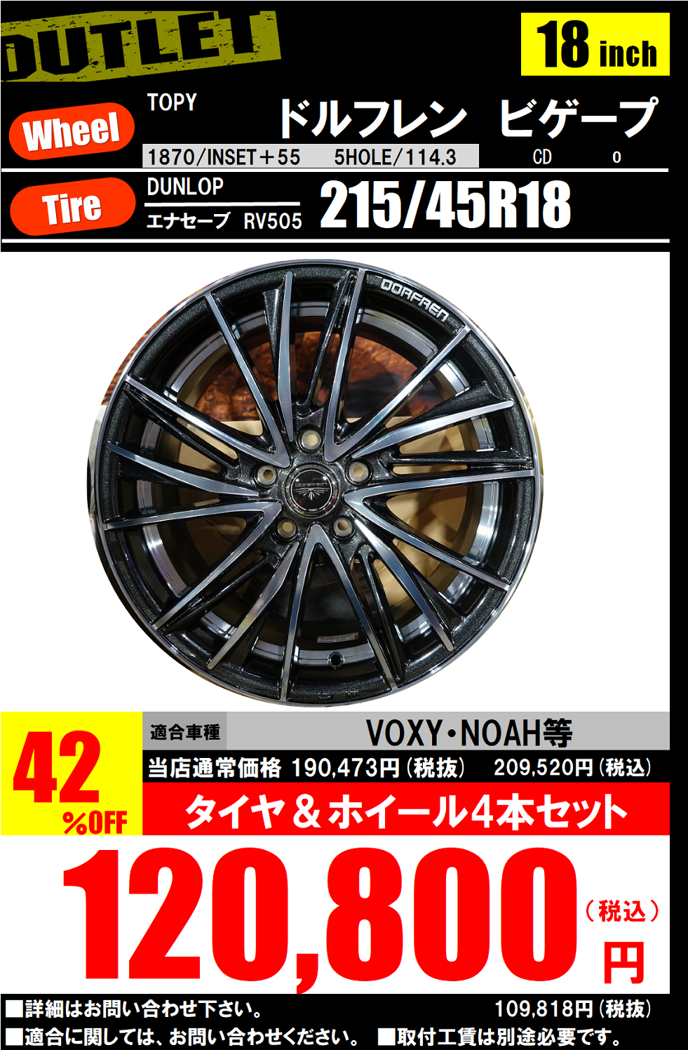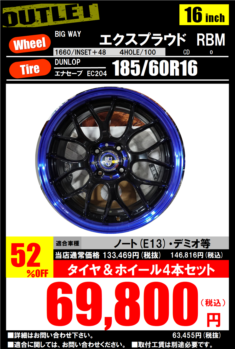店内在庫品大処分市 タイヤ・ホイールセット!! 現品のみ 在庫品がお買い得価格にて! 店頭にて展示してありますので、 早いもの勝ちになります。 『夏祭り』時点で完売しているかも知れません・・ ので、事前に在庫の問い合わせをお願いします。 ※ホイールクリックでメーカーHPへ・・