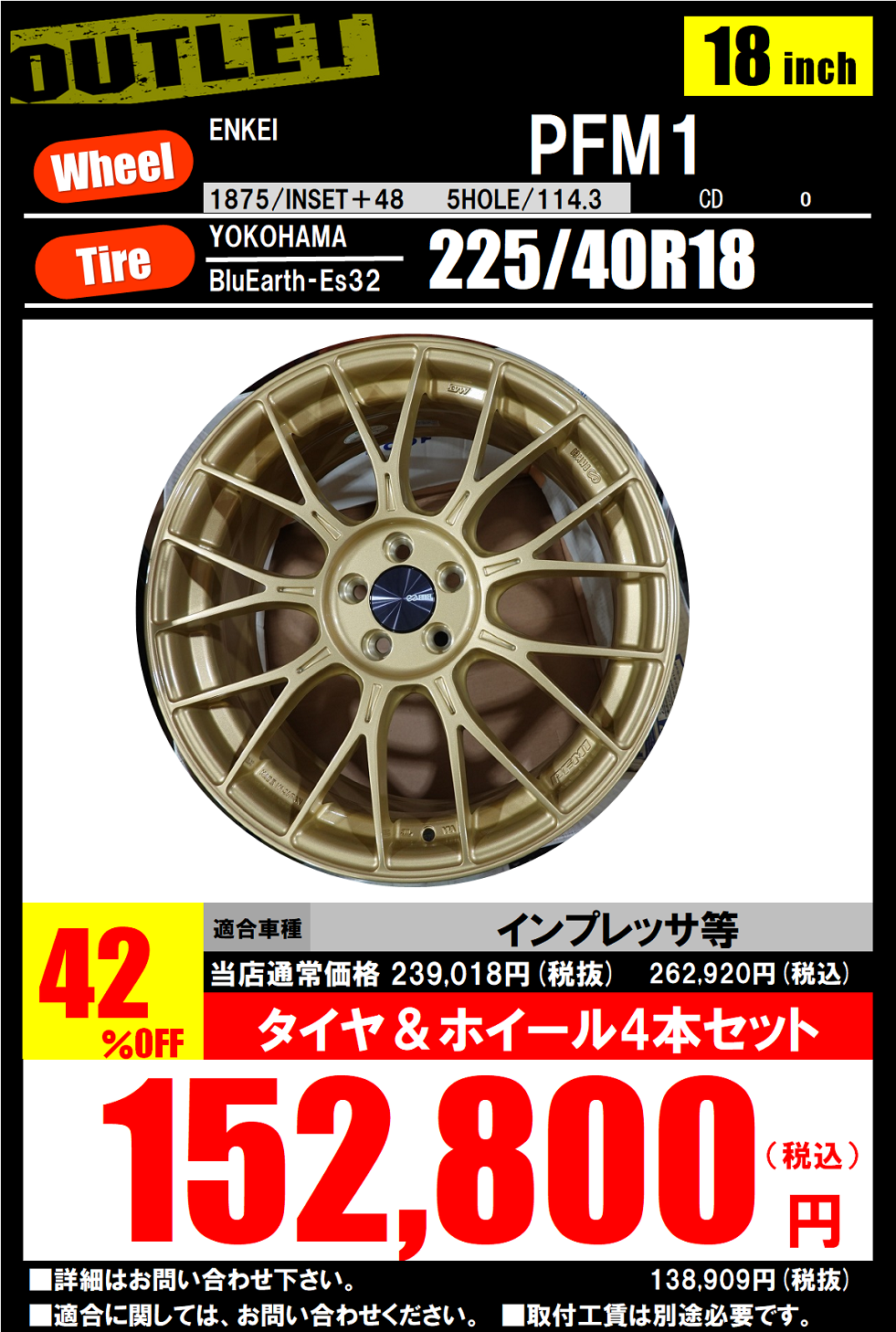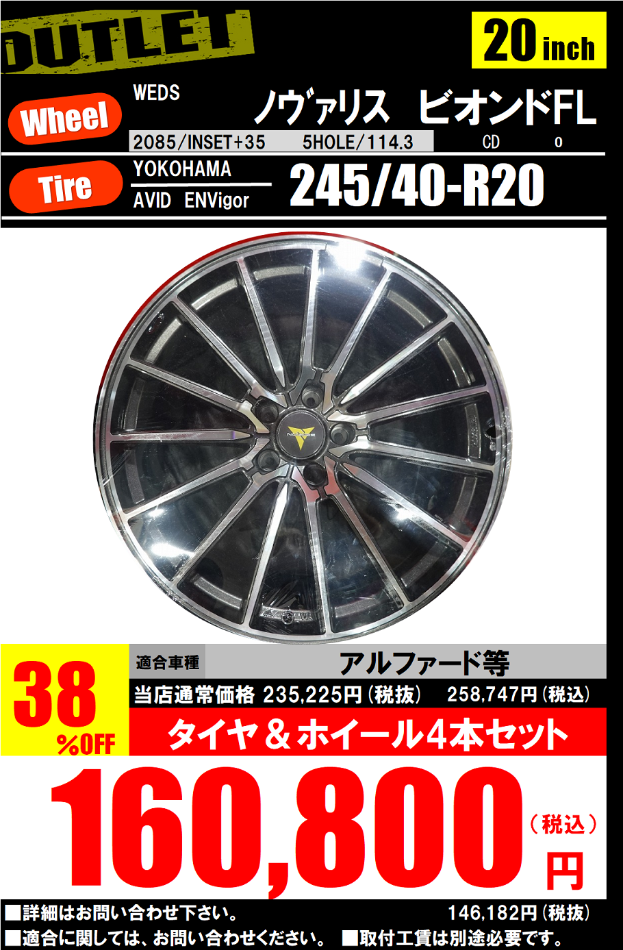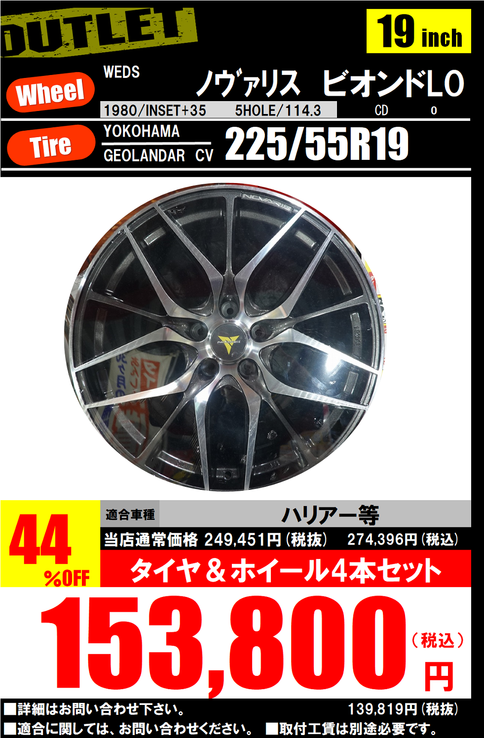 店内在庫品大処分市 タイヤ・ホイールセット!! 現品のみ 在庫品がお買い得価格にて! 店頭にて展示してありますので、 早いもの勝ちになります。 『夏祭り』時点で完売しているかも知れません・・ ので、事前に在庫の問い合わせをお願いします。 ※ホイールクリックでメーカーHPへ・・