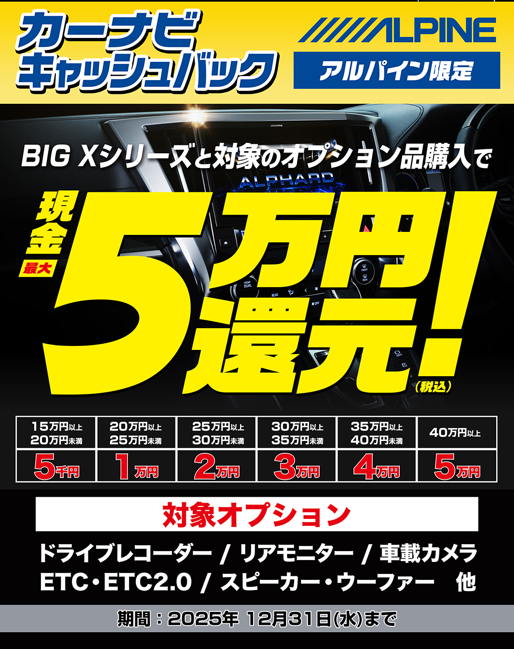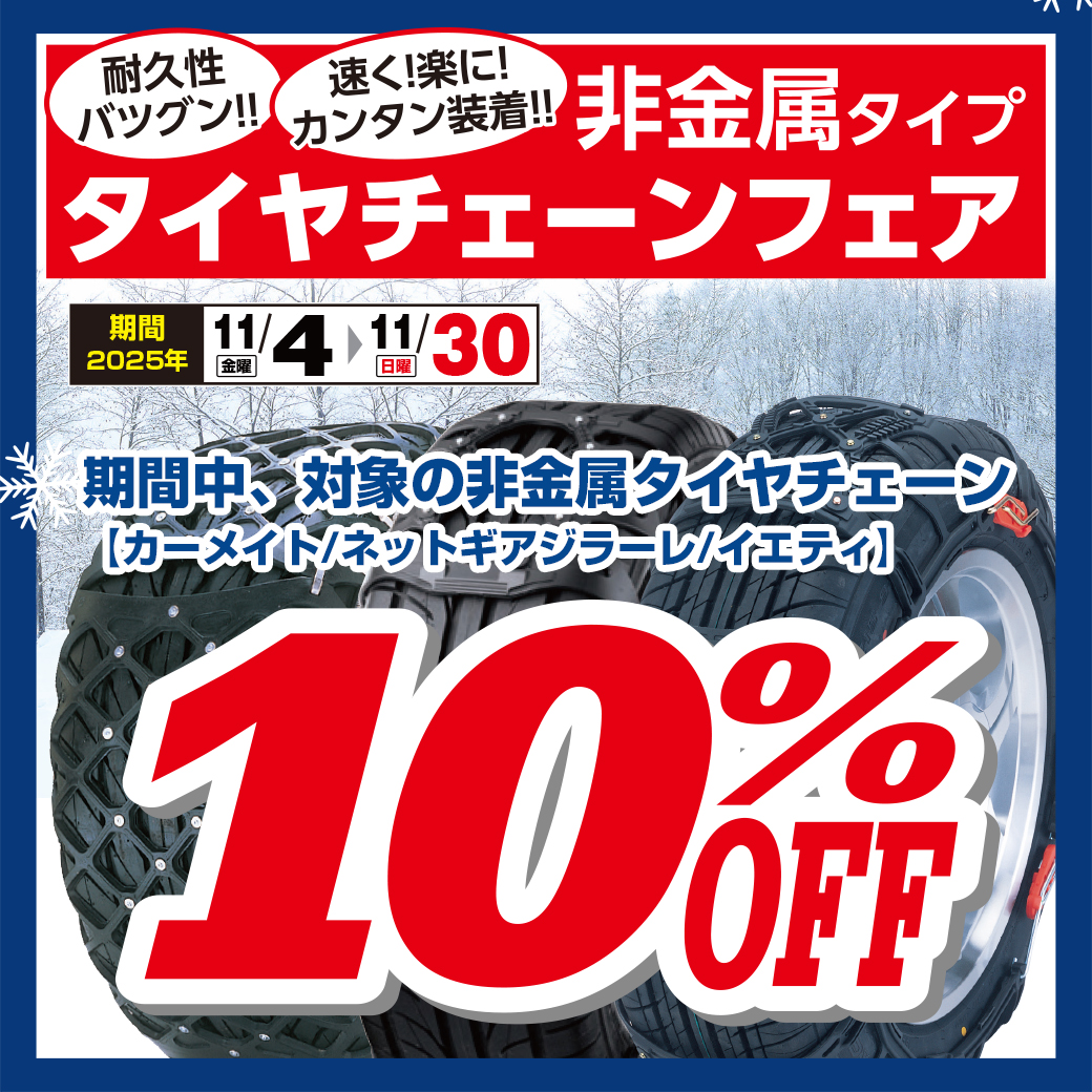 2025超タイヤ祭り開催![11/4~] アルパインBIG-Xシリーズご購入で 今なら特別還元!!💰 金額別で更にお得に! タイヤチェーン買うなら早期がお得 非金属チェーンが早期割引で10%OFF 冬の準備はお早めに!⛄