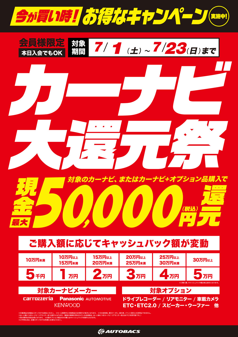 期間中、対象のカーナビゲーションと対象オプション品の購入金額に応じて、最大5万円もお得なキャッシュバックセールを開催!