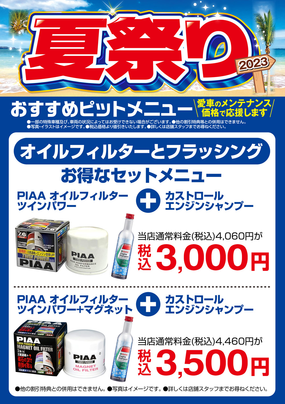 十日市場夏祭り「オイル」 夏祭り期間中はエンジンオイル交換もお得!【当店人気NO.1オイルがお得】エンジンオイルに必要な性能をしっかりと兼ね備えているカストロールの「EDGEシリーズ」を夏祭り期間毎日数量限定の特別価格でご提供致します。※ 数量限定のオイルご希望の場合は、その旨のコメント入力にご協力をお願いします。【オイルフィルターと内部洗浄がお得】ツイン構造のPIAAのエンジンオイルフィルターとエンジンオイルタンク内の洗浄に効果的なカストロール「エンジンシャンプー」を期間限定のお得なセット価格でご提供致します。愛車のメンテナンスは当店にお任せ下さい。